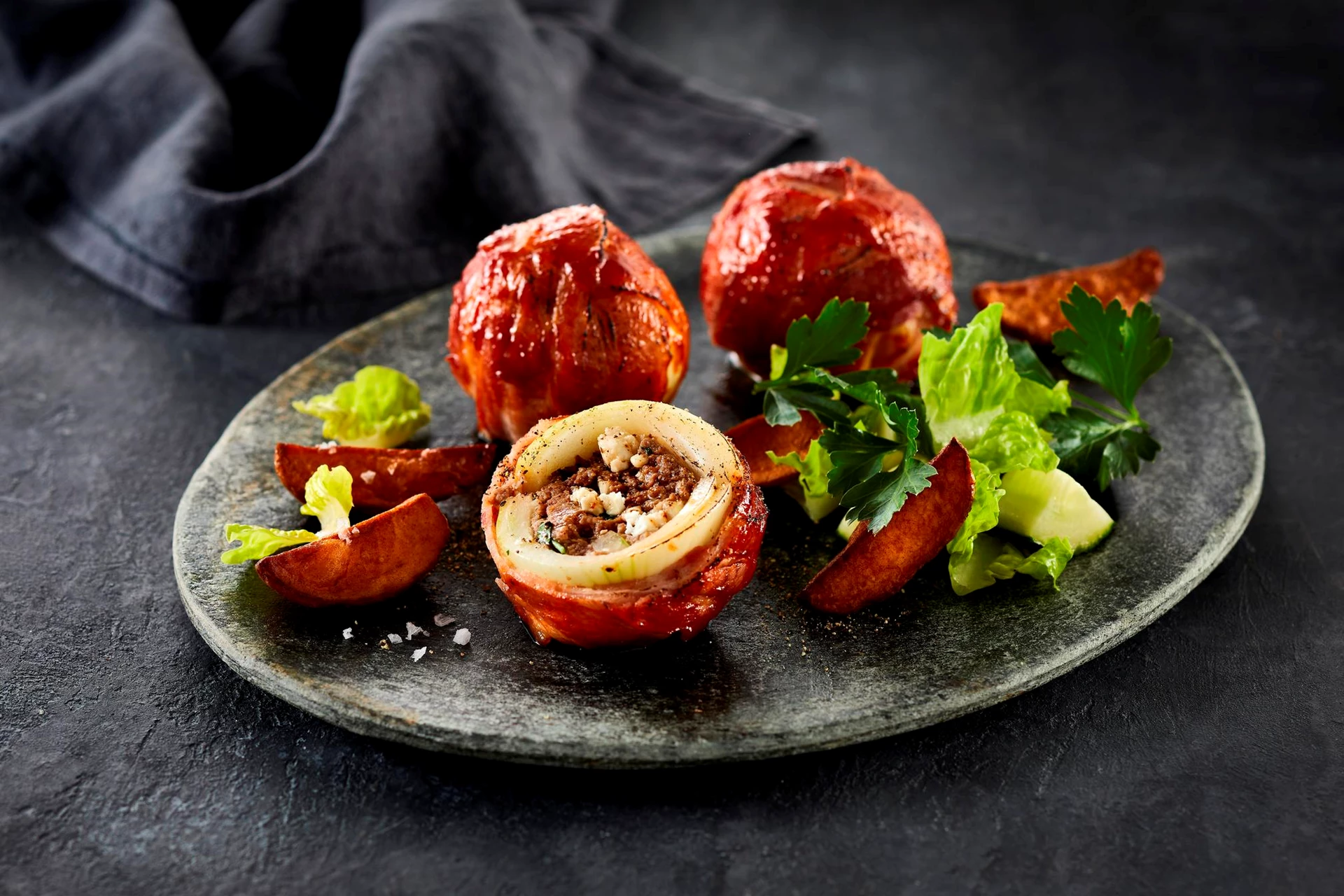 Saftige burgere, smagfulde gryderetter, hyggelige kødboller eller dampende varme ovnretter med sprød skorpe og boblende kanter. Kombi Hak kan være med hele vejen rundt i køkkenet, hvor du ellers bruger oksekød! Vi har tilføjet alle de gode grøntsager, som bidrager med smag – men ikke krydret med salt eller peber. Så derfor er tilberedning, krydring og servering 100 procent i dine frie hænder. Du kan bruge Kombi Hak i nøjagtig de samme opskrifter, hvor du ellers bruger rent oksekød – som i disse lækre Baconbomber med løg, kartoffelbåde og salat.