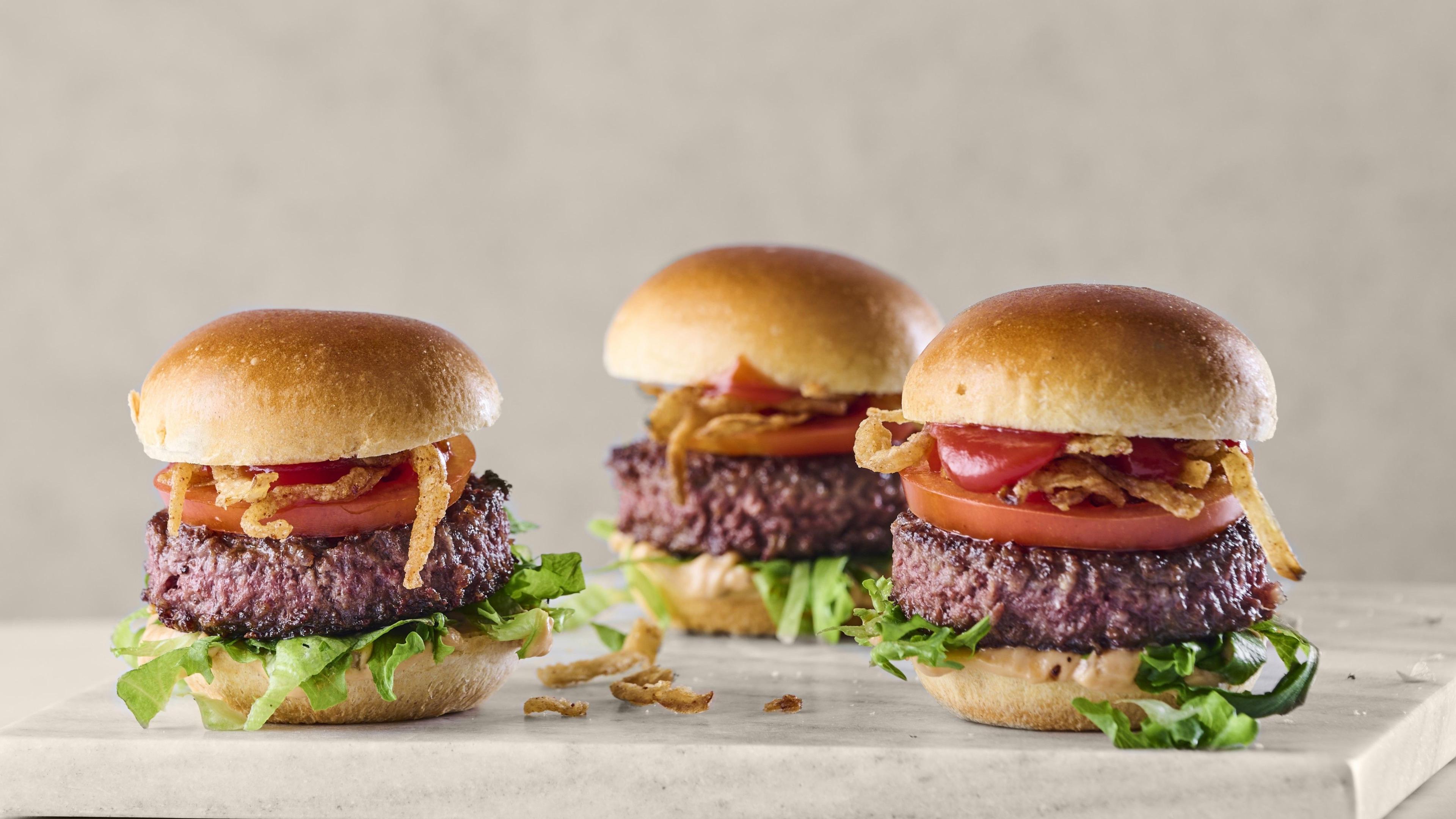 Vi har nemlig blandet oksekødet med grønt i form af rodfrugter, rehydreret ærteprotein og fermenteret løg. Og så har vi formet kødet til burgerbøffer, som enten kan købes i rå tilstand til stegning, eller tilberedt sous vide, som du bare skal brune på panden og krydre, inden bøffen pakkes ind i en laber burger.