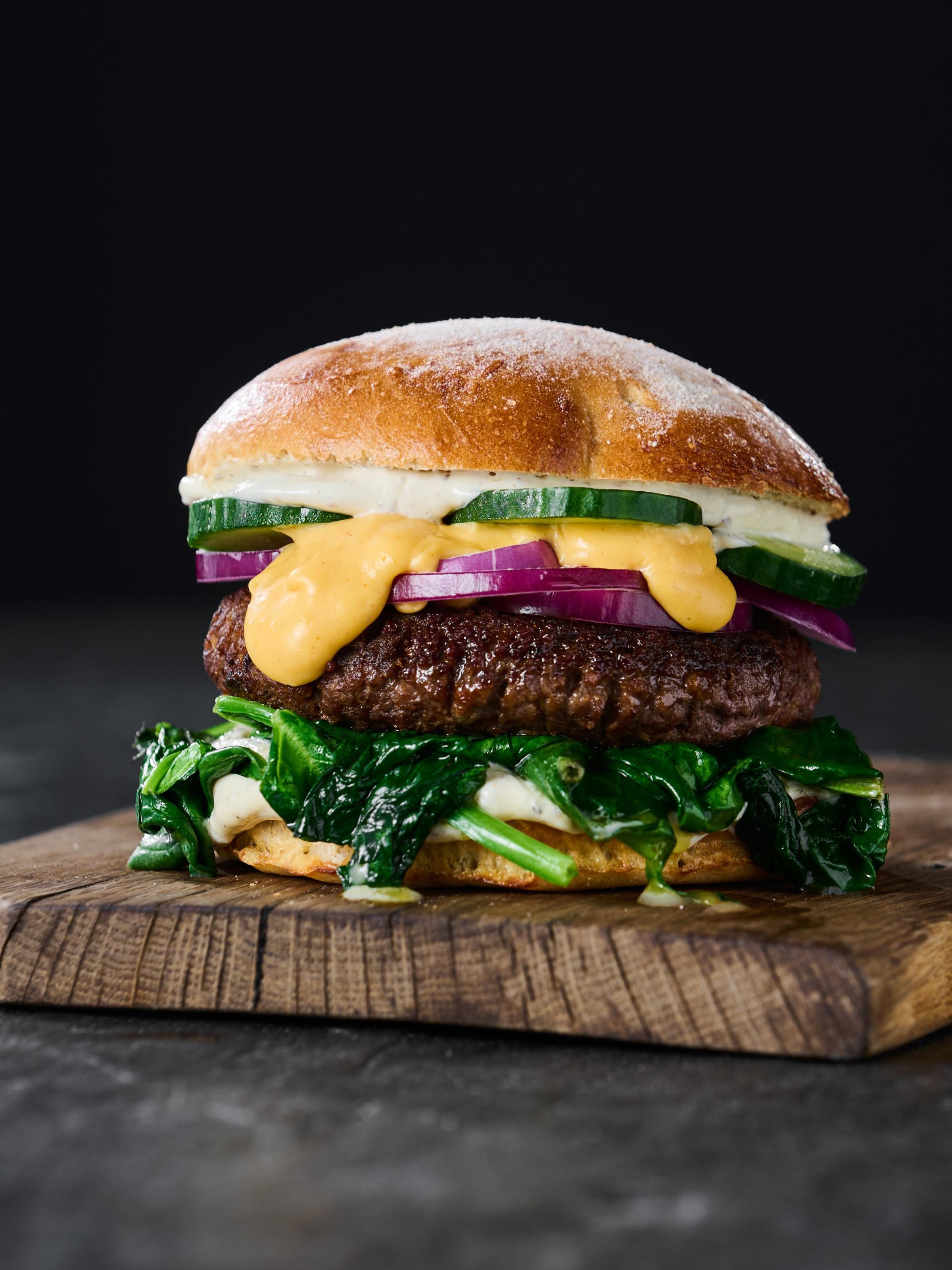 Prøv en burger med stegt spinat, urtecreme, rødløg, agurk og en smagfuld ostesauce med rød cheddar