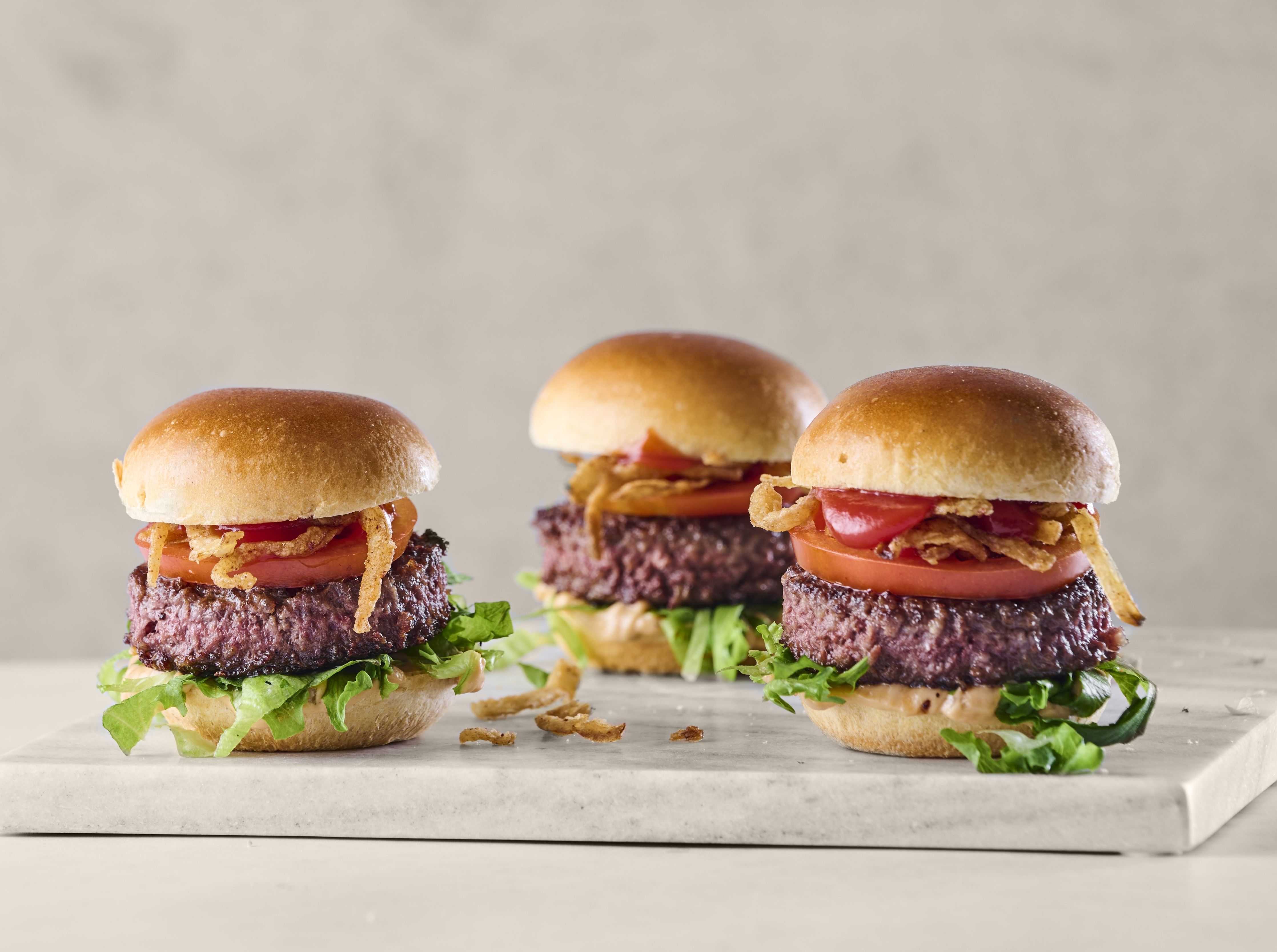 Vi har nemlig blandet oksekødet med grønt i form af rodfrugter, rehydreret ærteprotein og fermenteret løg. Og så har vi formet kødet til burgerbøffer, som enten kan købes i rå tilstand til stegning, eller tilberedt sous vide, som du bare skal brune på panden og krydre, inden bøffen pakkes ind i en laber burger.