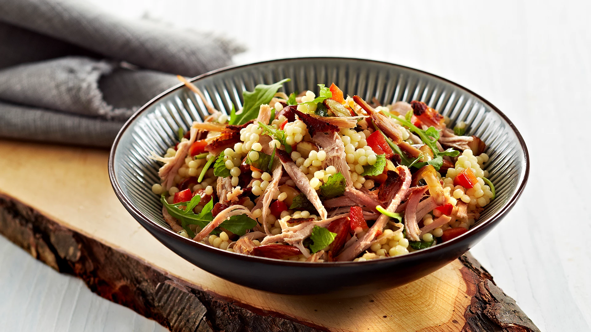 Du kender sikkert couscous, som er små forkogte gryn af hvede. Perlecouscous er en lidt større version, lidt a la små pastakugler, og de er rigtig gode til at suge smag til sig. Og det får de i denne ret fra frisk rød chili, mynte, løg og din egen yndlingscitronvinaigrette. Heri vendes tilberedt, afkølet pulled pork, lavet på krydret bov fra dansk gris. Og så tilføjes der masser af pebret grønt i form af rucola, samt knas fra ristede mandler. En fest af smagsoplevelser i én ret!