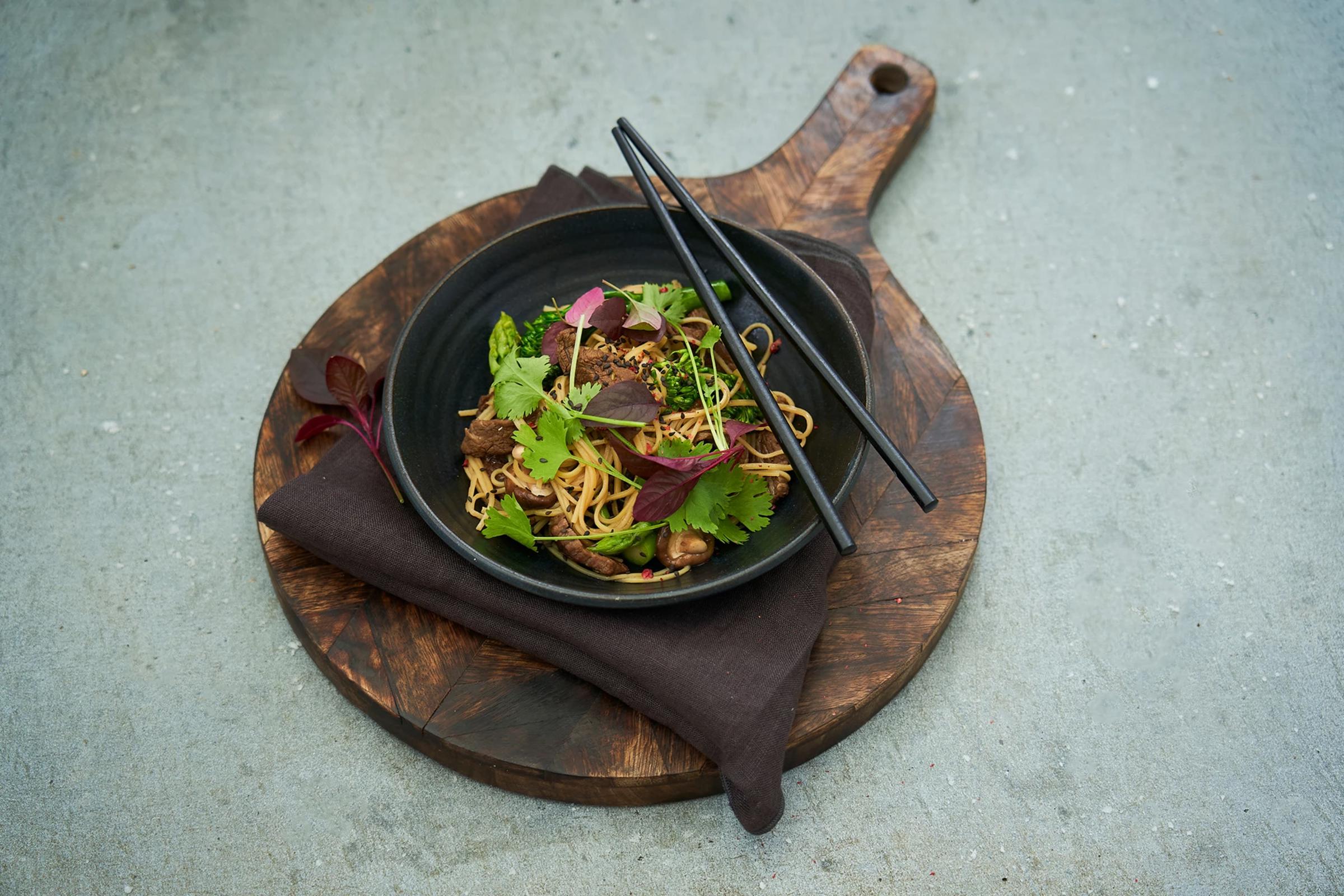 Her er der asiatisk comfort food for alle pengene! Stjernen i showet er lækker, mager okseklump, der skæres i tynde strimler og ristes godt af - men stjernen får selskab af masser af grønt, såsom forårsløg, grønne asparges og broccolini. Desuden tilføjer vi ekstra umami med ristede shiitakesvampe. Og så bliver det hele krydret med ingefær og hvidløg samt en lækker sauce på soja, sesamolie og cremet tahin. Smørbløde kogte nudler vendes i, og så skal der selvfølgelig grønt på toppen i form af koriander og amarant plus sorte sesamfrø. Herlig streetfood med hilsen fra Østen.