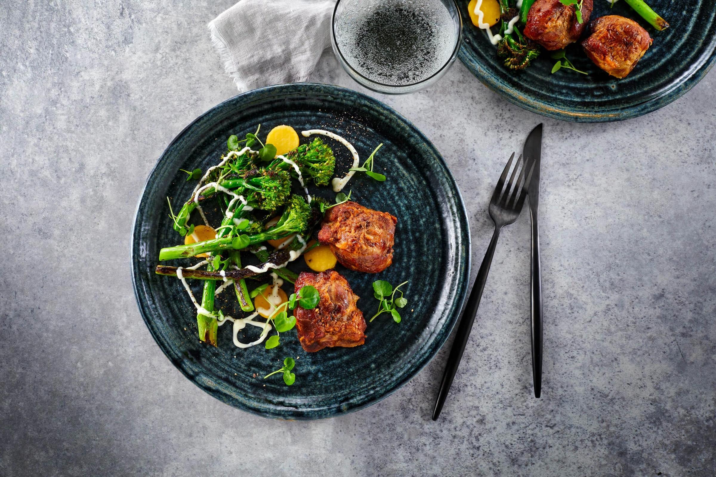 Toum-hvad-for-noget? Måske kender du ikke den mellemøstlige hvidløgscreme, toum, men se den som en slags aioli, bare uden æg. Der er smæk på smagen, men det skader heller ikke i januar. Cremen serveres til skankeklumper, der er fyldt med æbler og svesker, og desuden tilsat neutral lage, så kødet holder sig supersaftigt, når det steges gyldent og lækkert i ovnen. Til retten serverer vi hjemmesyltede, sprøde kålrabi, som giver et godt knas til maden, og grillede broccolini, der smager som en drøm med den skarpe hvidløgsdip.