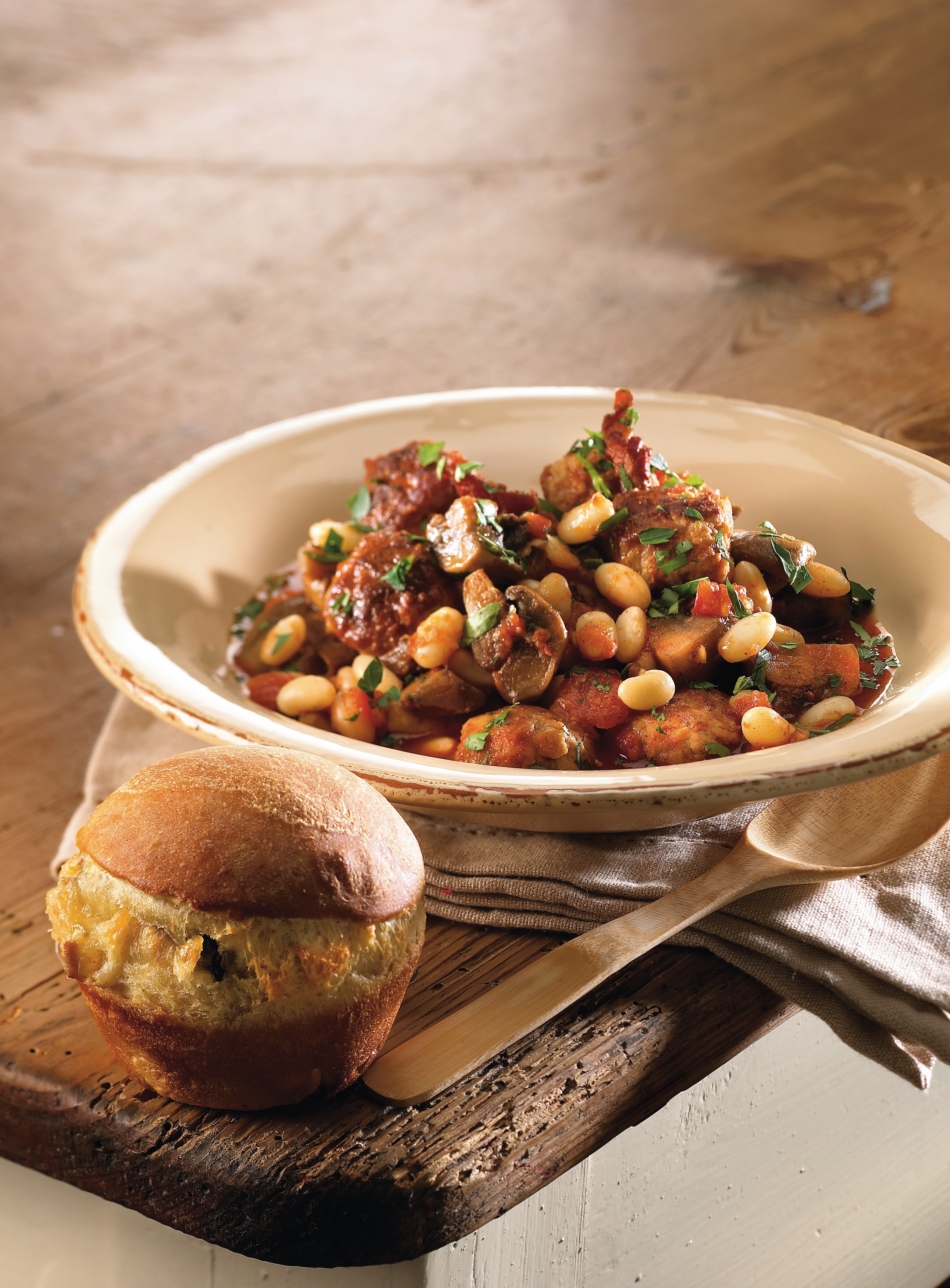 Minifrikadeller og smørmøre hvide bønner i en skøn, krydret tomatsauce er perfekt ’comfort food,’ når efteråret snart sætter ind for alvor. Og i forhold til opskriften kan du endda skrue ned for frikadellerne og op for bønnerne i retten. Portionsanret i glas med en skive lunt ostebrød – så er der ikke nogen, der ’fisker’ efter dellerne.