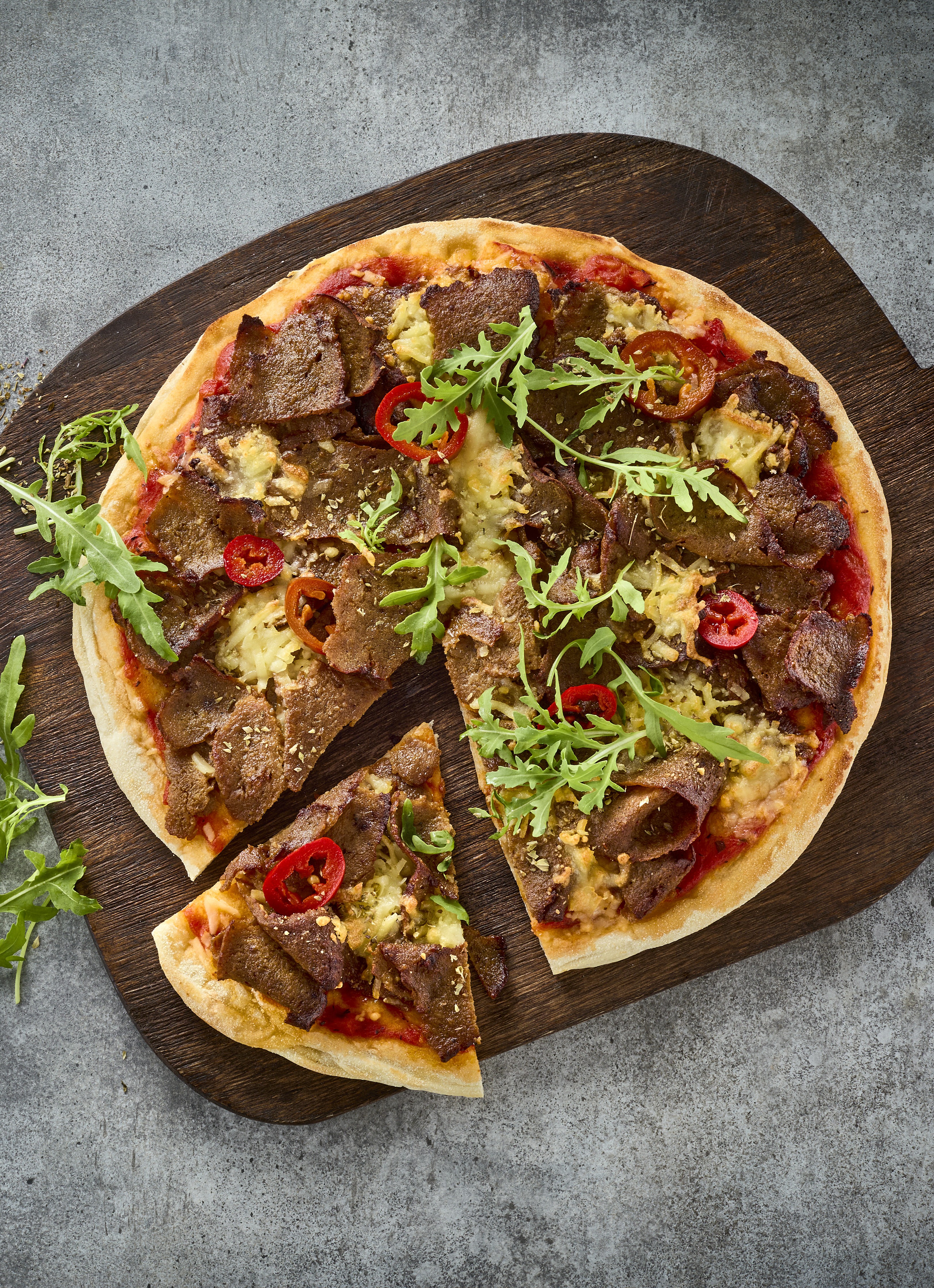 Saftigt kød og aromatiske krydderier på pizzaen – ja tak! Det er de kendte smage fra det mellemøstlige køkken, der kommer i spil på pizzaen sammen med kødtoppings som Iskender Kebab, Spicy Beef Chunks af hakket, krydret okse, eller Pandegyros.