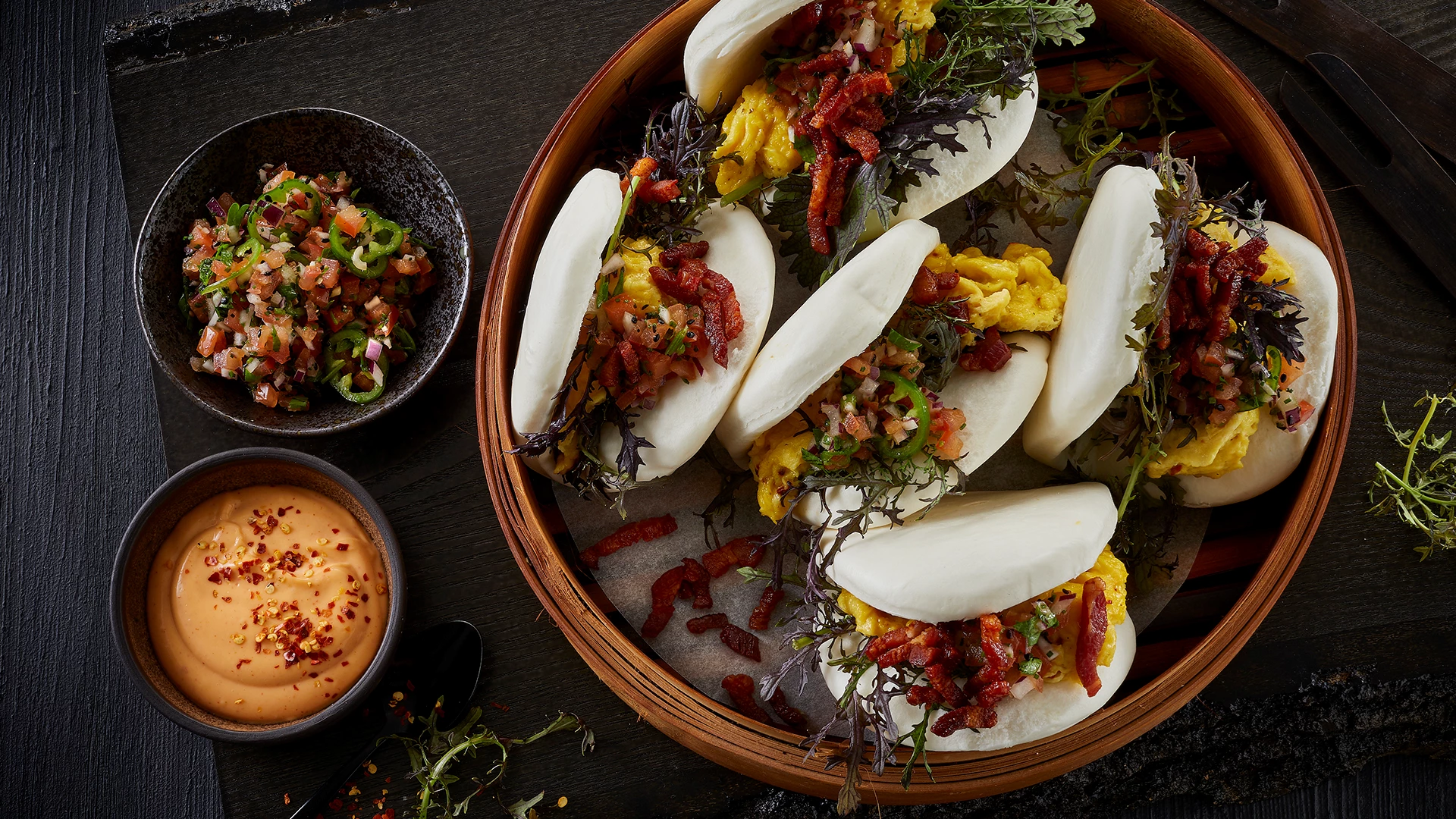 Bao med bacon, scrambled eggs og tomatsalsa