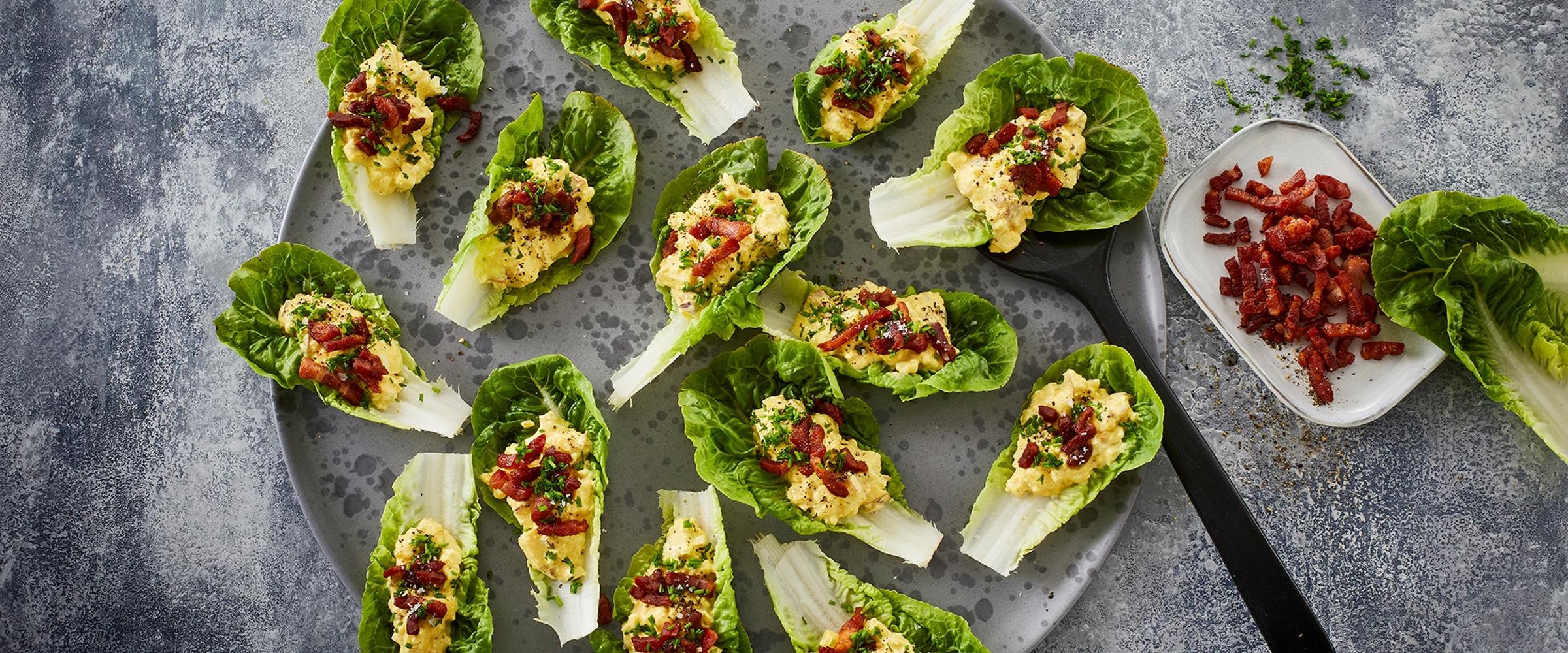 Æggesalat er en rigtig sandwich-klassiker, men i denne opskrift bliver det et sprødt blad af hjertesalat, der bliver underlaget for æggesalaten. Den bliver rørt på creme fraiche og hytteost, og får lækkert crunch og smag af rødløg og små, syrlige æbletern. Prikken over æ(gg)’et er selvfølgelig knasende tern af sprødt bacon, som også giver god kontrast til den cremede salat.