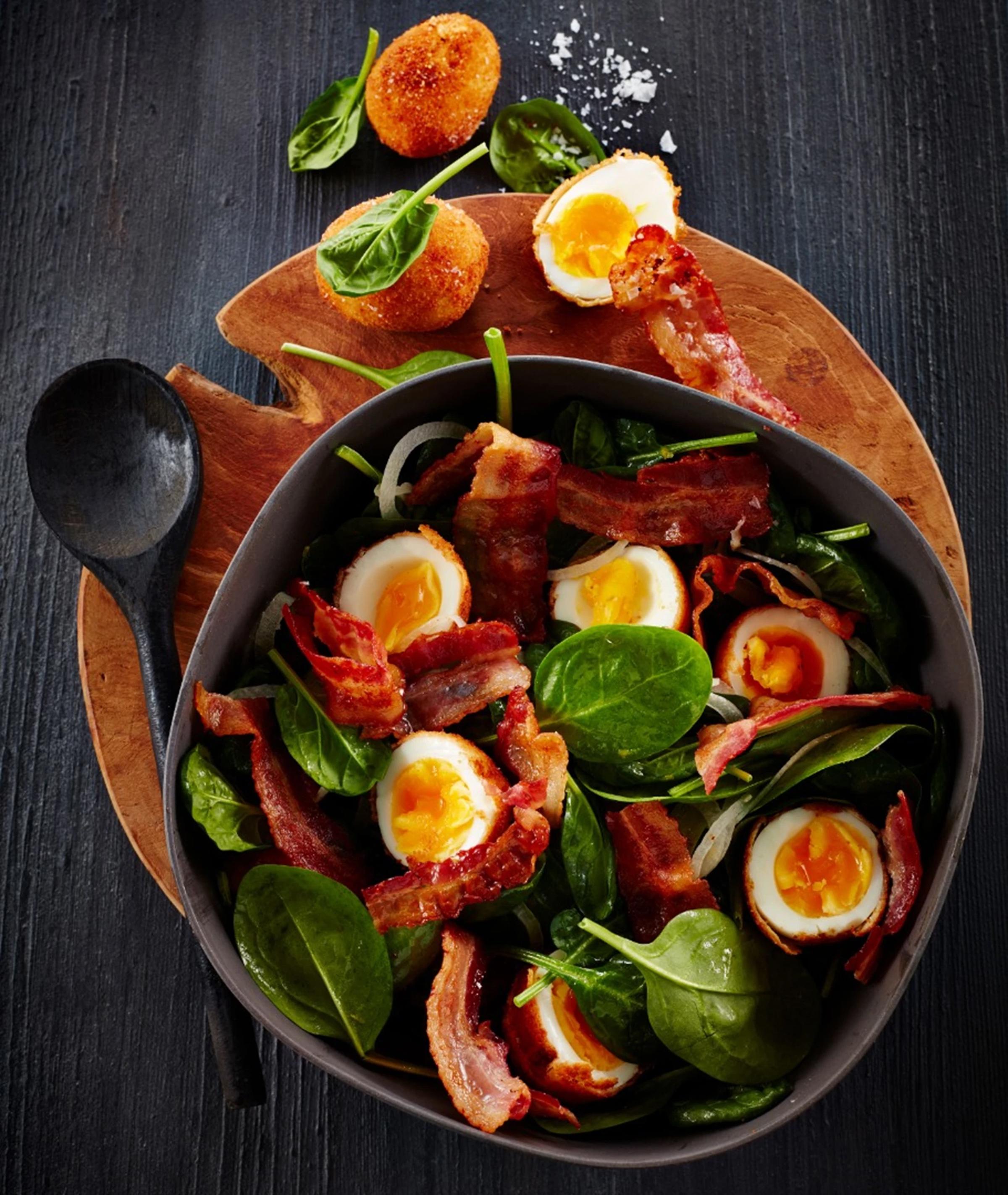 Friterede æg med spinat, bacon og salatløg