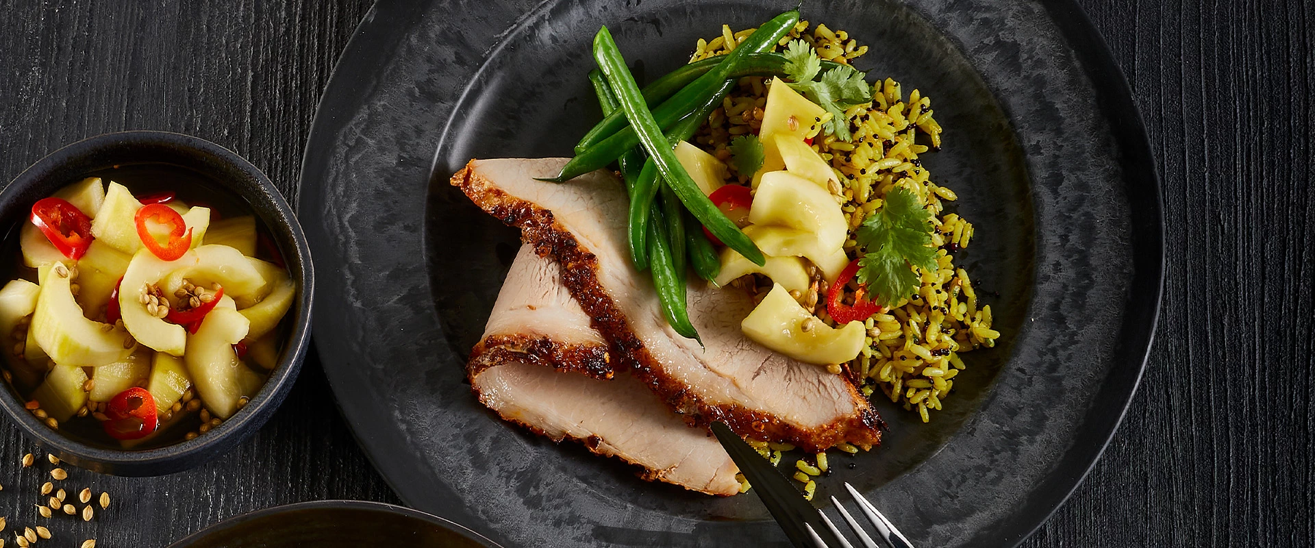 Den klassiske steg til hovedret går aldrig af mode til festerne. Her serverer vi en skinkesteg fra vores Tender Pork sortiment, hvor kødet er tilføjet lidt neutral lage – det sikrer nemlig en supermør steg, som også holder sig virkelig saftig under hele Farbror Svends tale! Her er tilbehøret blandt andet en krydret sauté af ris og quinoa, spicy agurker og en lækker aromatisk creme med koriander.