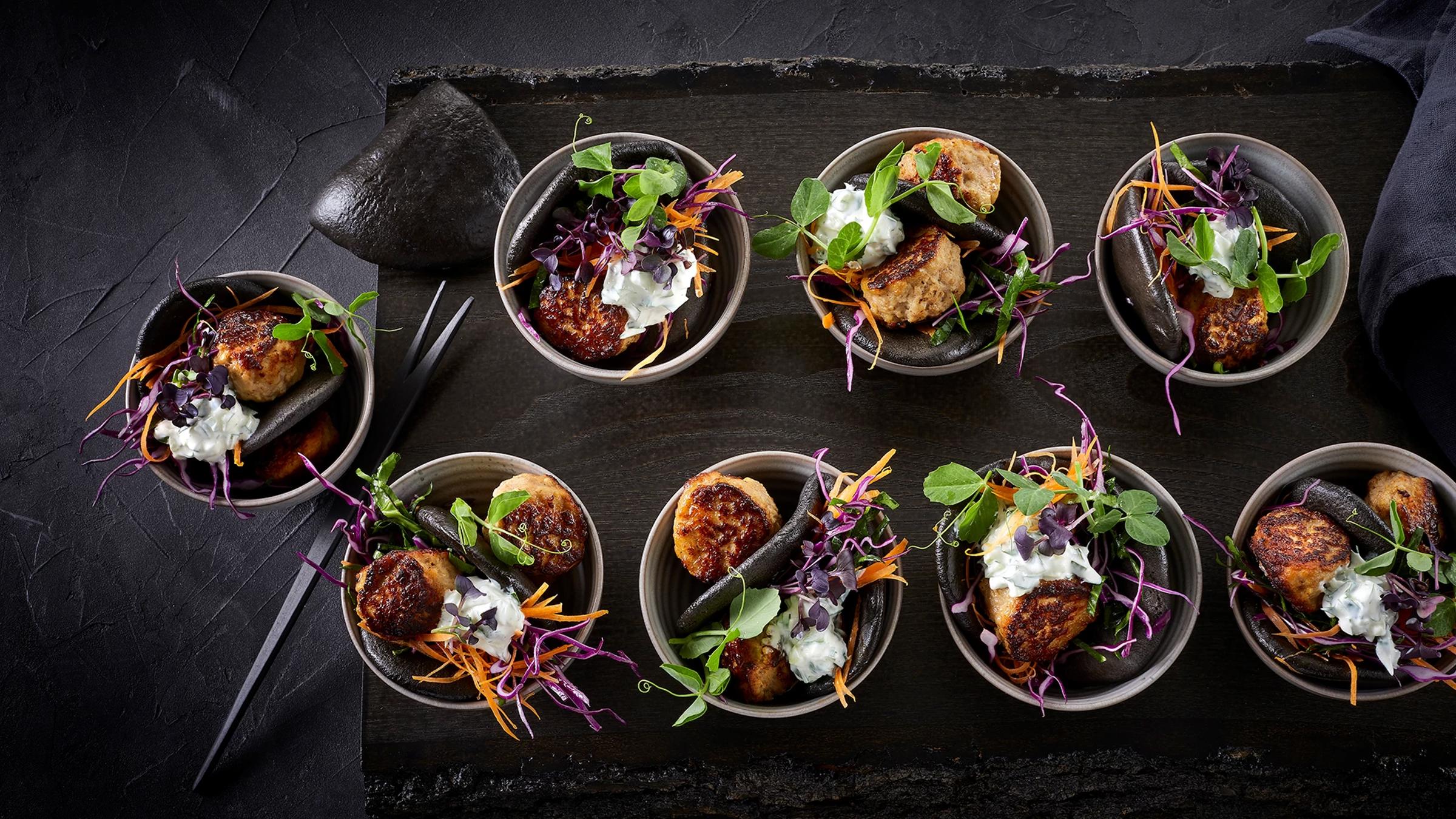 Mange unge er vilde med asiatisk madkultur – men de elskede, danske klassikere frister også, når konfirmationsmenuen skal bestemmes. Her får dine gæster lidt af hvert med en festlig og farvestrålende servering, hvor Mester’s lune frikadeller serveres i en asiatisk bao, her i en kulsort version. Serveringen får masser af kontrast med råkost i flotte farver. Sæt endnu mere fut i retten ved at erstatte tzatziki med en hot chilimayo.