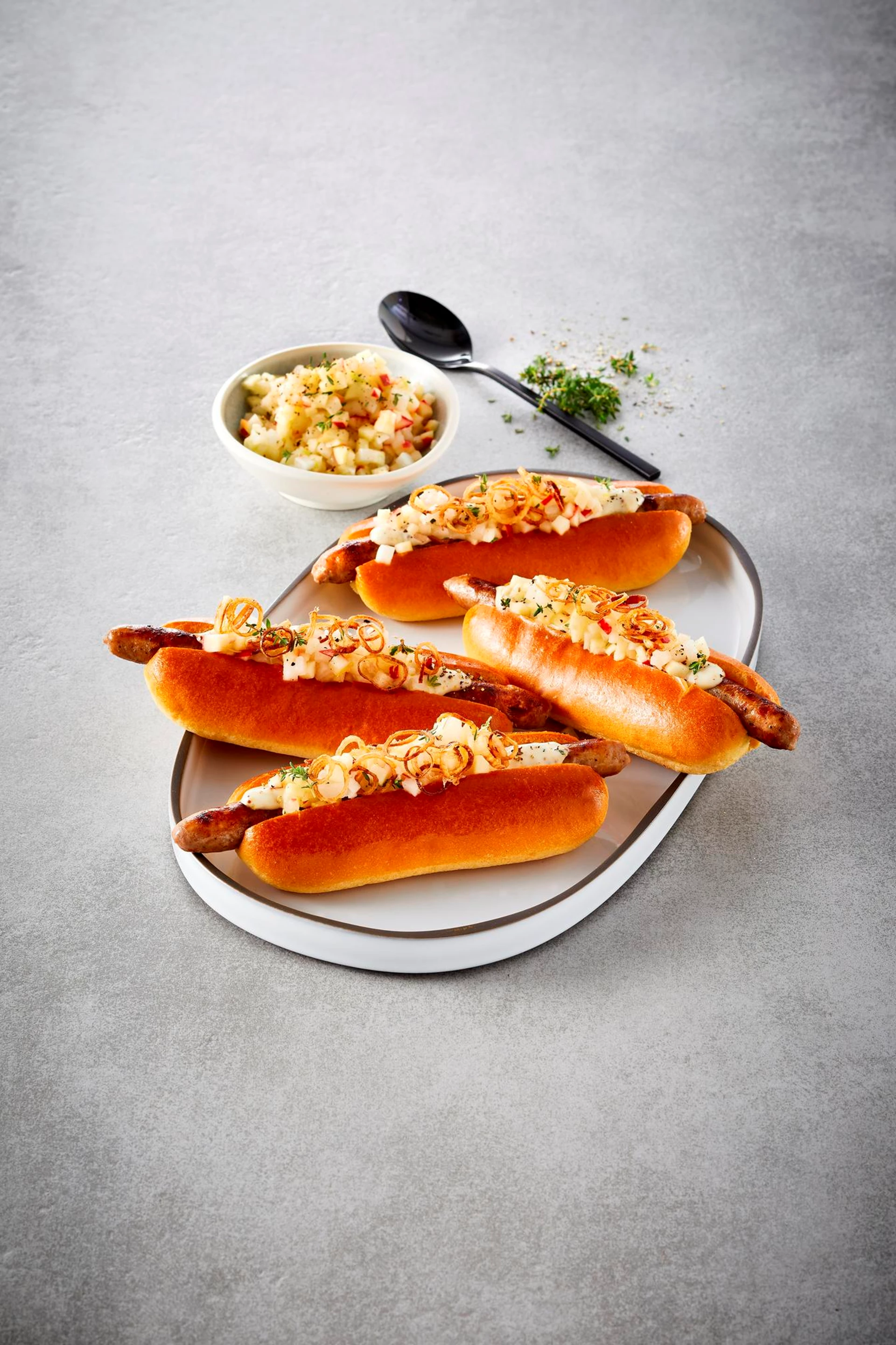 Den klassiske hotdog har fået et ordentligt twist her, hvor sennep og ketchup er erstattet af en cremet, grov sennepsmayo og en frisk, sprød relish med syrlige æbler. Og så er de ristede løg naturligvis hjemmelavede!