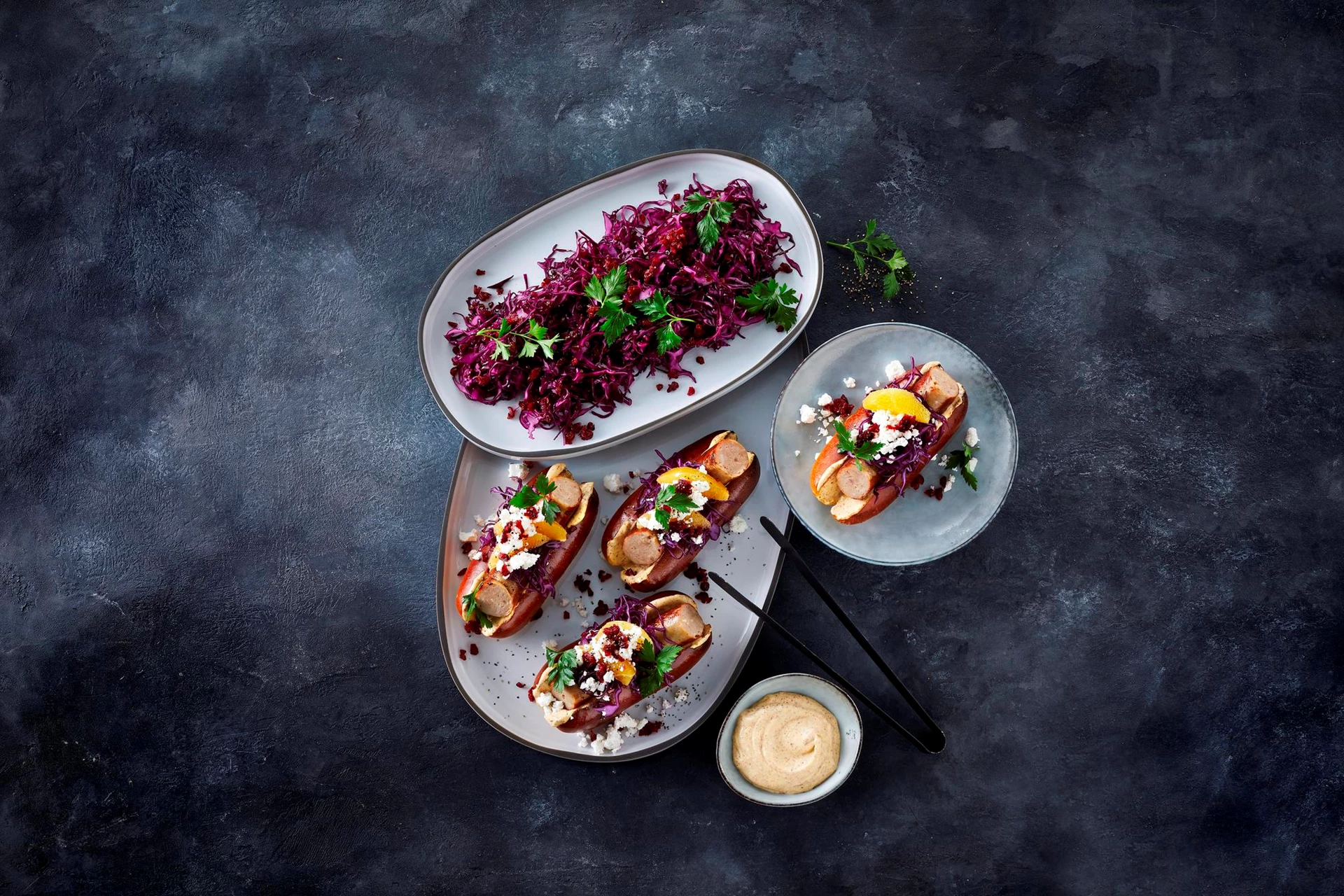 Når man ser på kompositionen af denne smagfulde, fyldige hotdog, får man næsten lyst til at markere, at der cirka er et halvt år til juleaften! For her er vi på banen med vores traditionelle medister, som i hotdog-format toppes med dijonnaise, appelsin og rødkålssalat med tranebær. En klassisk kombination i et nyt format!