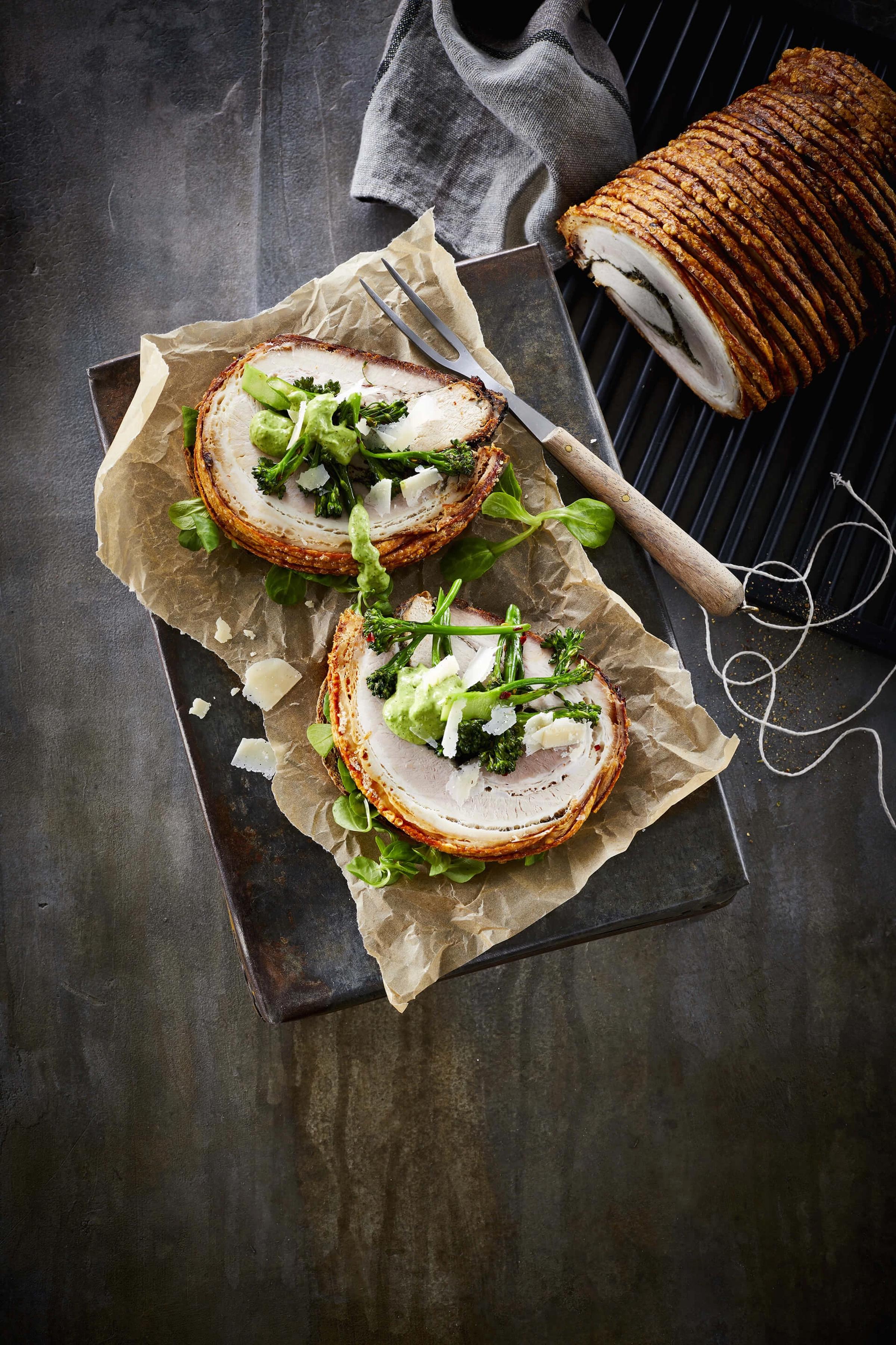 Porchettaen er noget af en darling i rigtig mange køkkener. Her serveres porchettaen i en sandwich med chilistegt broccoli og en mayo, smagt til med godt med persille. En rigtig forårssandwich. Du kan også droppe brødet og servere steg og grønt sammen med marinerede, nye kartofler.