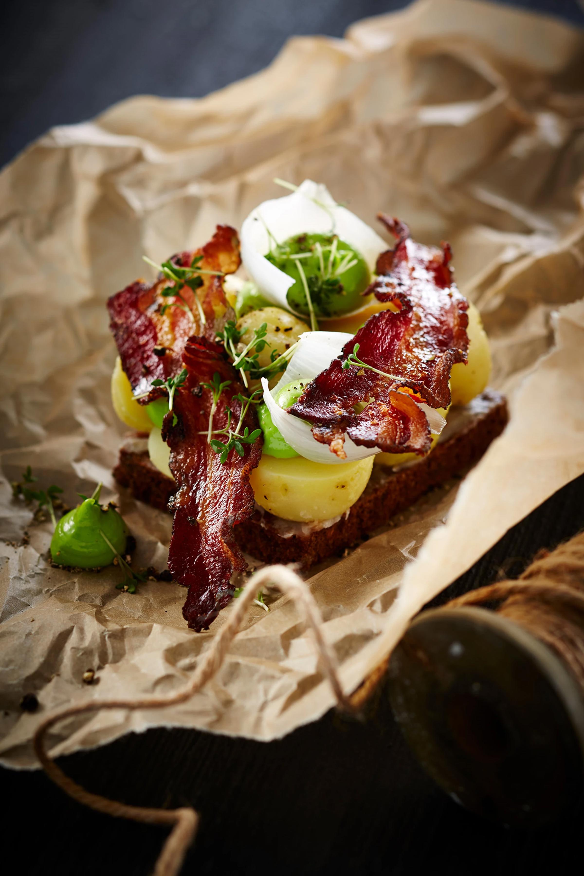 Hvem elsker ikke en kartoffelmad? Særligt når kartoflen er en af årets første nye, søde og faste kartofler. Kartoffelmaden er et ikonisk stykke smørrebrød og kan varieres i rigtig mange retninger. Her får maden et strejf af forår med den næsten neongrønne mayo, der får sin farve fra en hjemmelavet ramsløgsolie – så husk lige at få høstet (eller købt) ramsløg, mens de er i topform!