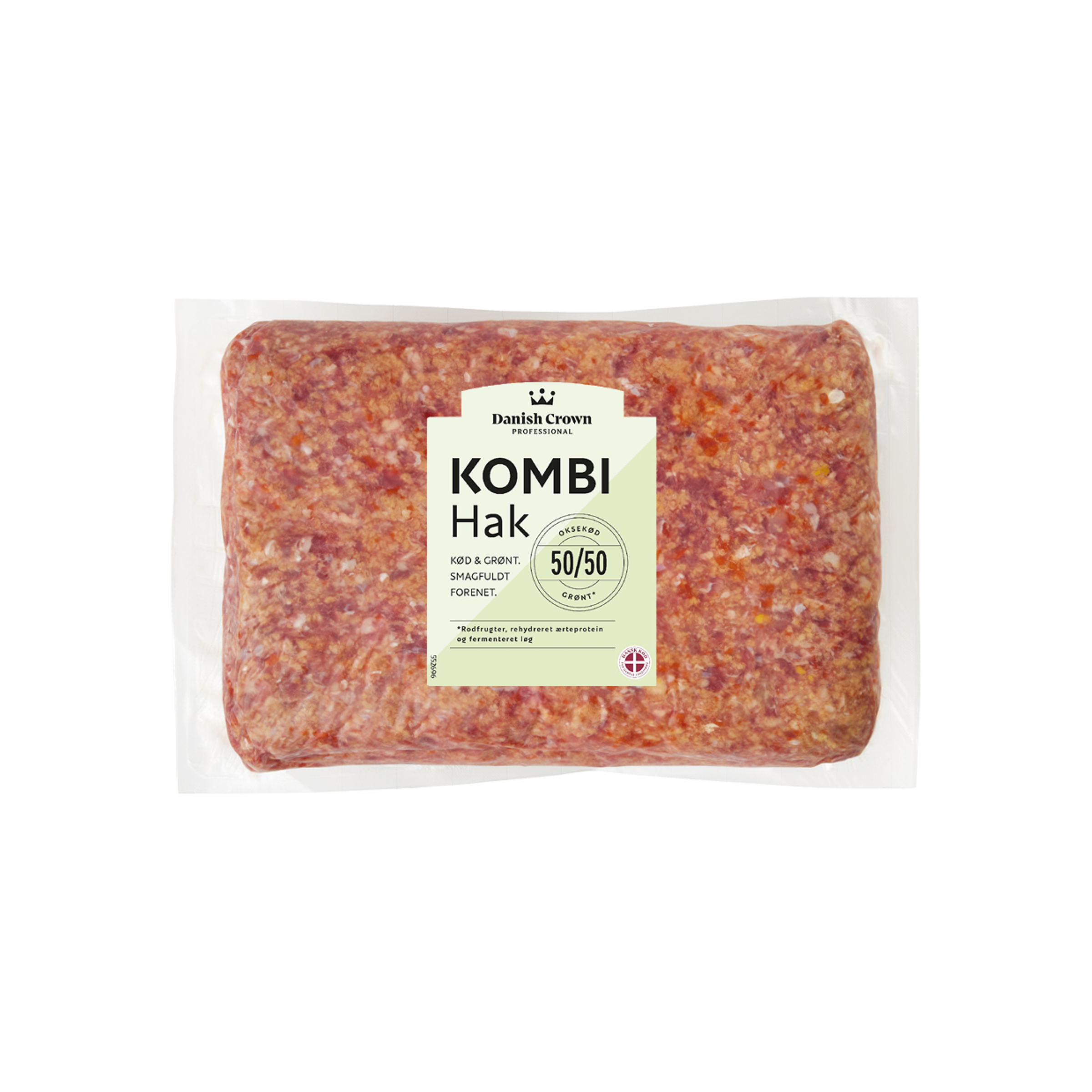 KOMBI Hak består af 50 procent hakket dansk oksekød, 20 procent rodfrugter (gulerødder og pastinak) og resten ærteprotein fra flækærter samt fermenteret løg.