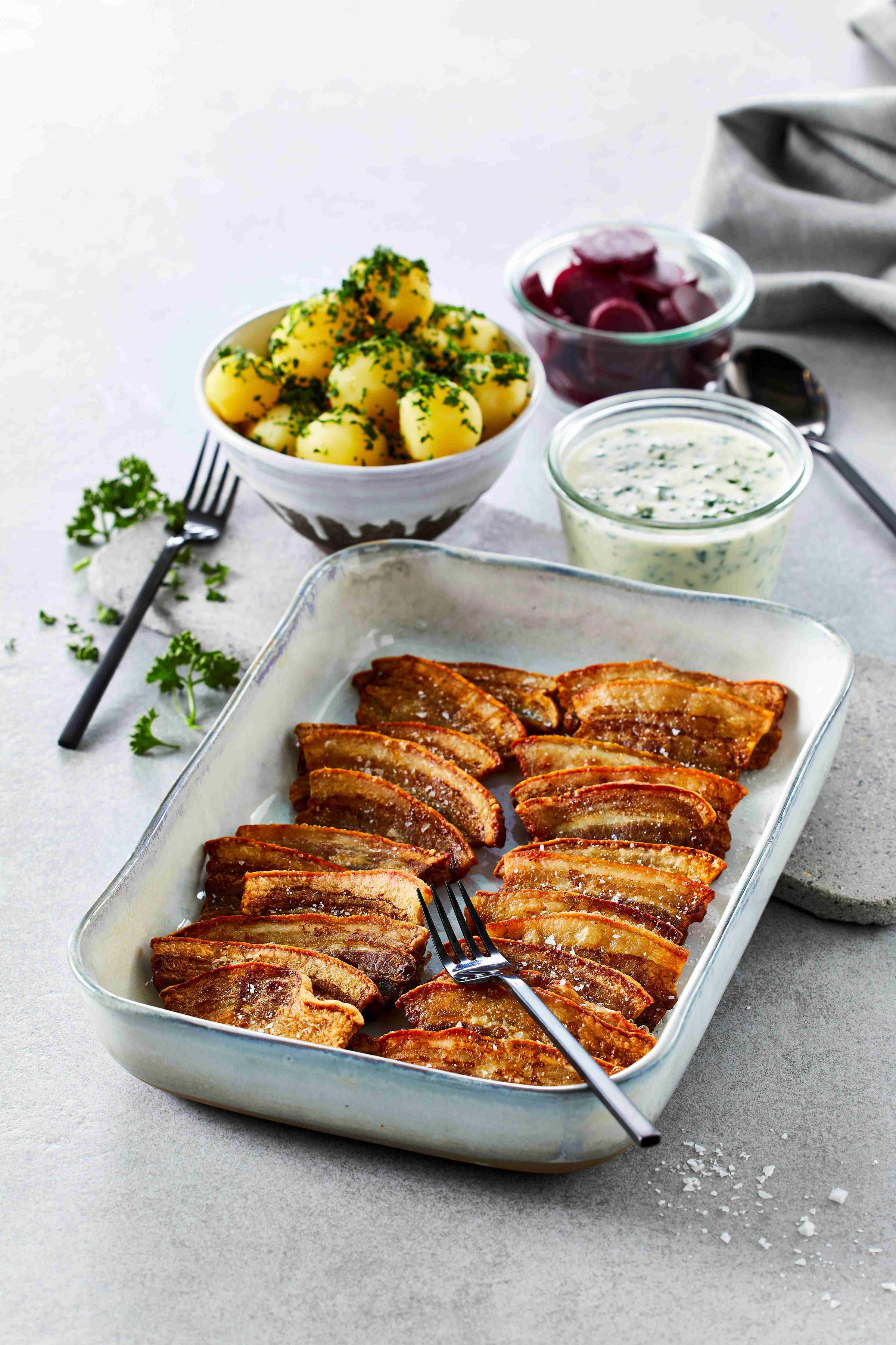 Stegt flæsk med krydderurtemarinerede kartofler: