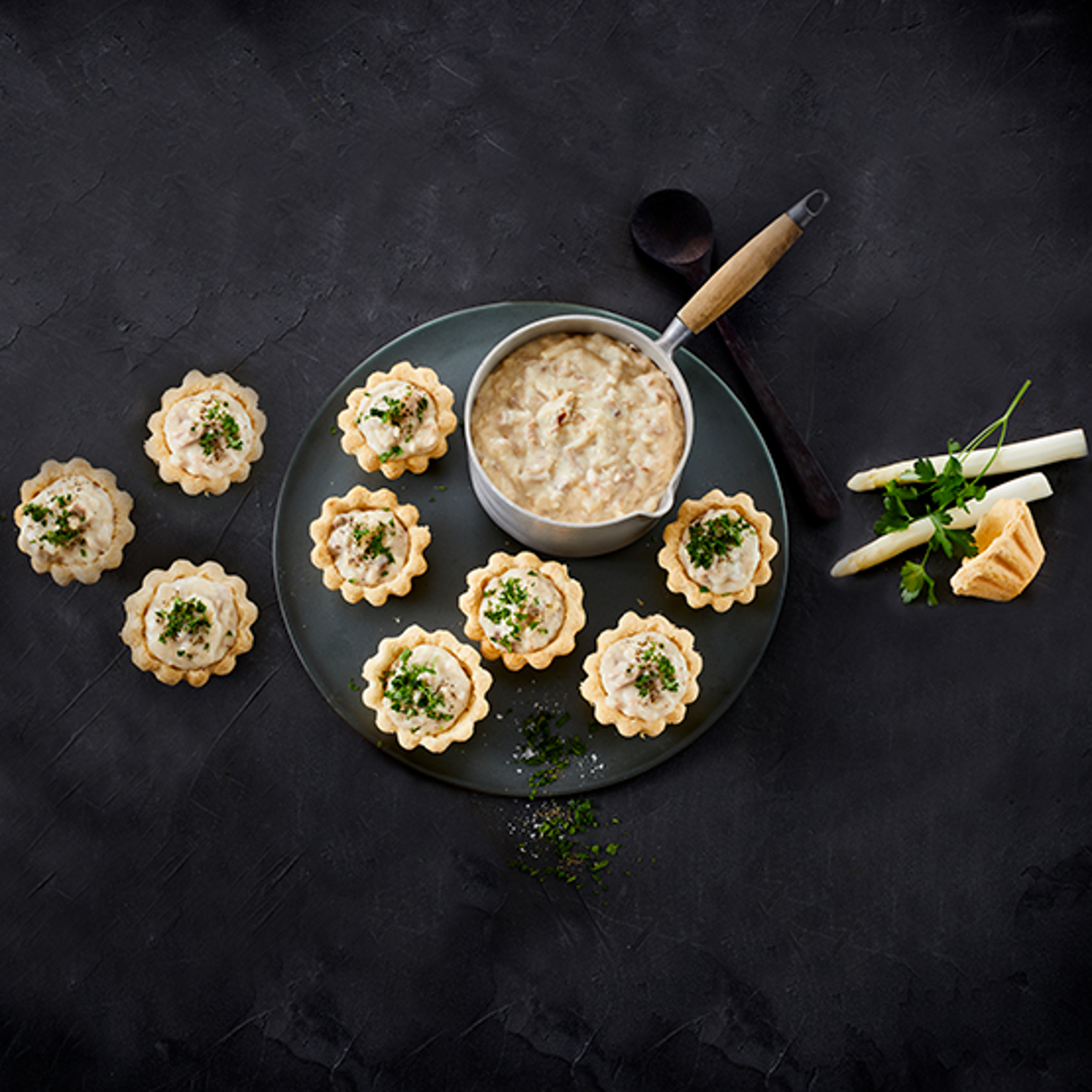 Tarteletter er en af de retter, der tager allerflest kegler hos gæsterne, uanset alder og geografi. Nu kan du få en hjælpende hånd med i køkkenet, når du sætter denne livret på menuen, med vores ultraklassiske tarteletfyld, lavet helt old school på kyllingekød i en cremet sauce med asparges og fløde.