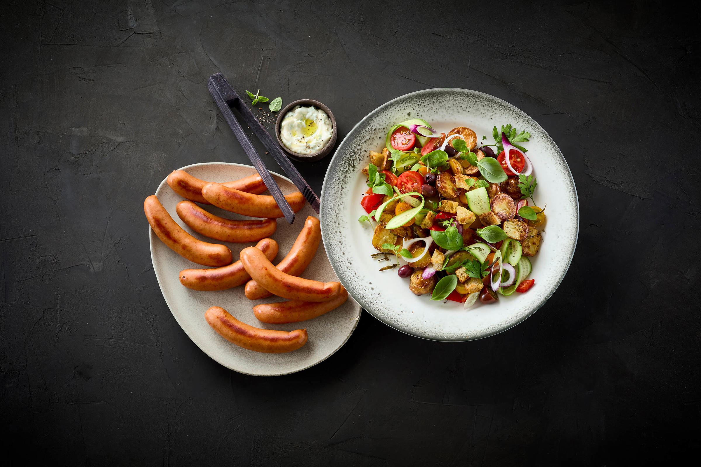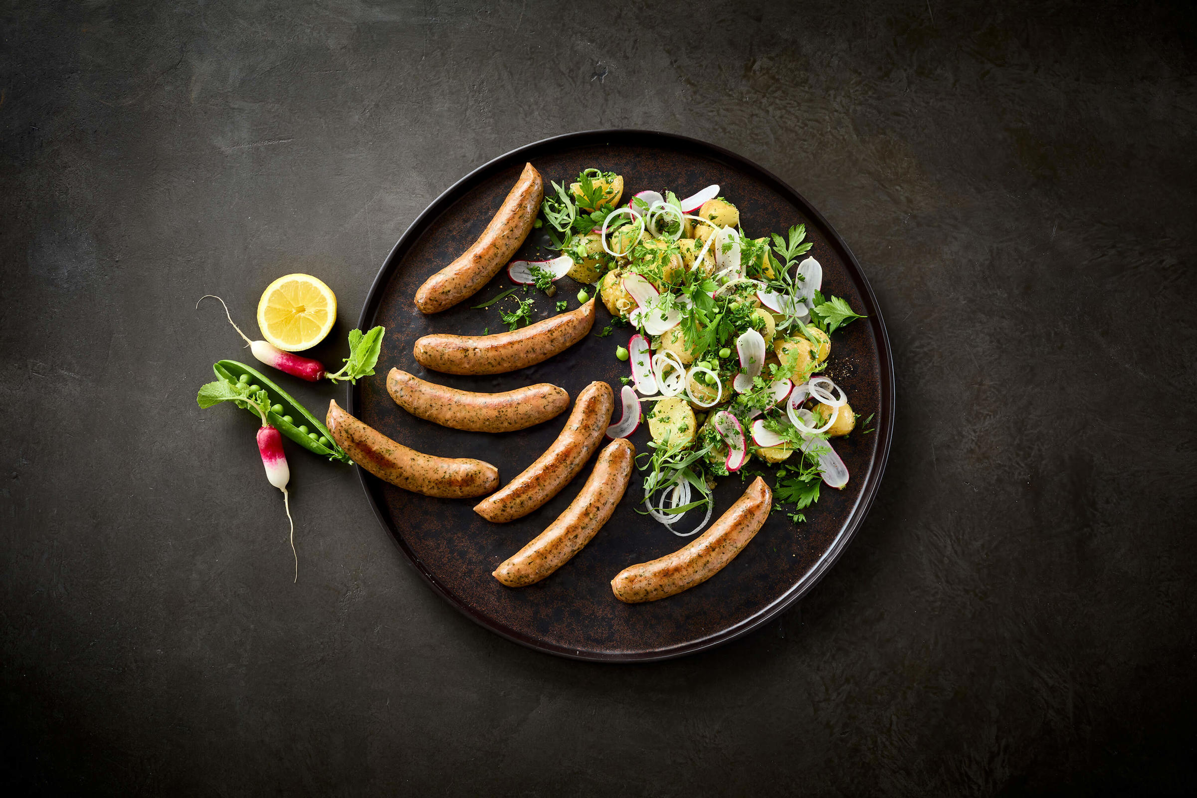Her bruger vi den nordisk krydrede Bacon/ramsløg frokostpølse. Og selvom den cremede ’hvide’ kartoffelsalat er en dansk klassiker, har vi her fundet inspiration i det franske køkken til en frisk og lidt lettere marineret kartoffelsalat.