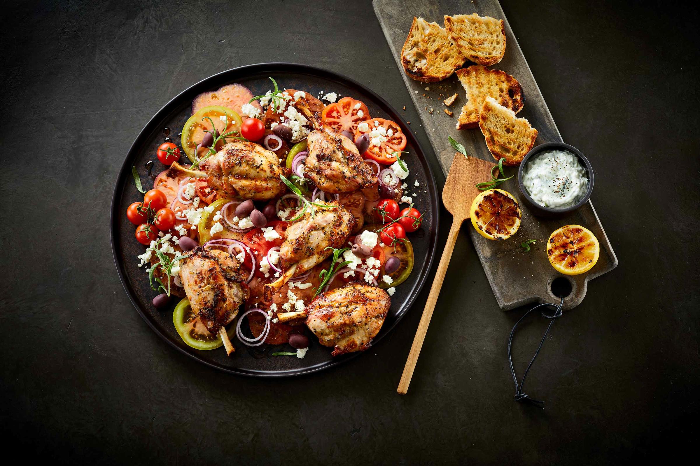 Grillkøller med pebermarinade, tomatsalat og grillet brød