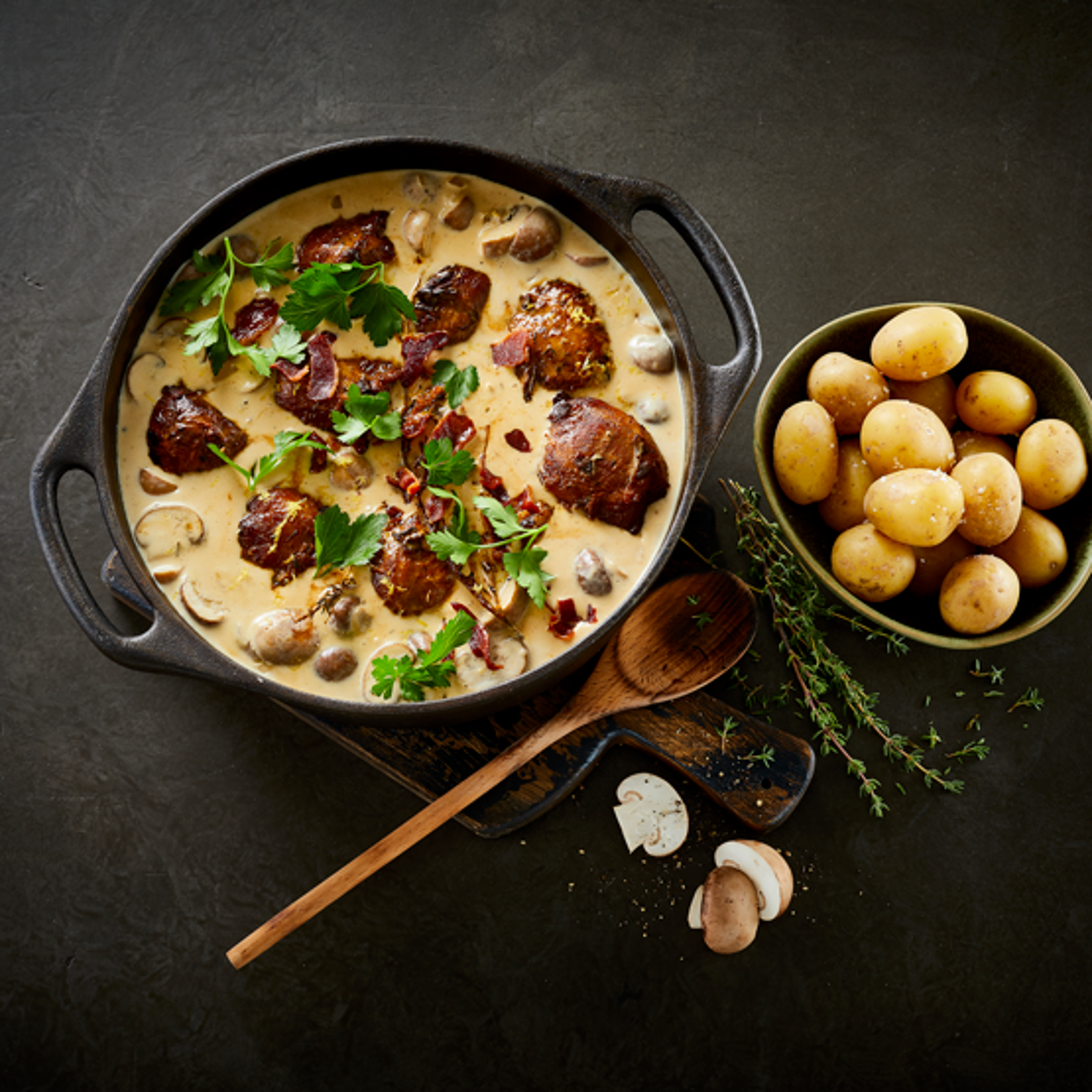 I denne opskrift går vi ’all in’ på drømmen om Comfort Food og serverer de tilberedte skankeklumper i en virkelig cremet svampeflødesauce, der mættes med skyen fra kødet og toppes med sprød bacon, persille og citronskal. Vi serverer kogte kartofler til, men en grov rodfrugtmos vil også sidde lige i skabet.