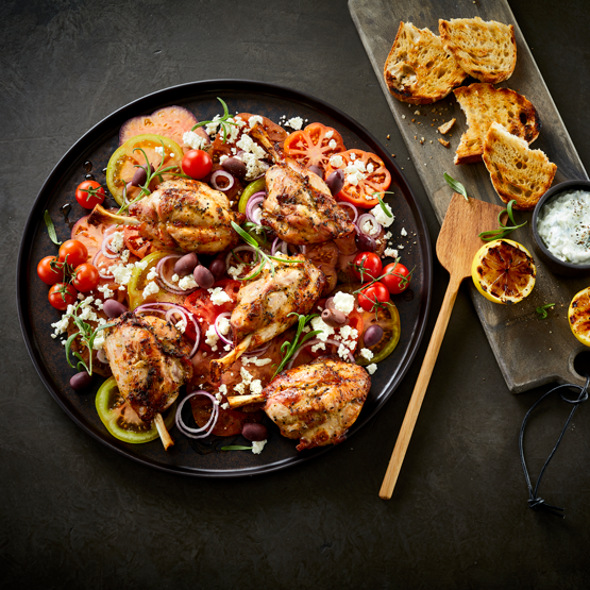 I denne opskrift har vi for eksempel vendt smagsløgene mod Grækenland, hvor grillet gris også er en klassiker på menukortet. Vi griller eller ovnsteger grillkøllerne og serverer dem med en smuk tomatsalat i flere farver, toppet med feta og oliven, en cremet tzatziki med masser af friske krydderurter og grillet surdejsbrød. Så skinner solen på selv en regnfuld dag!