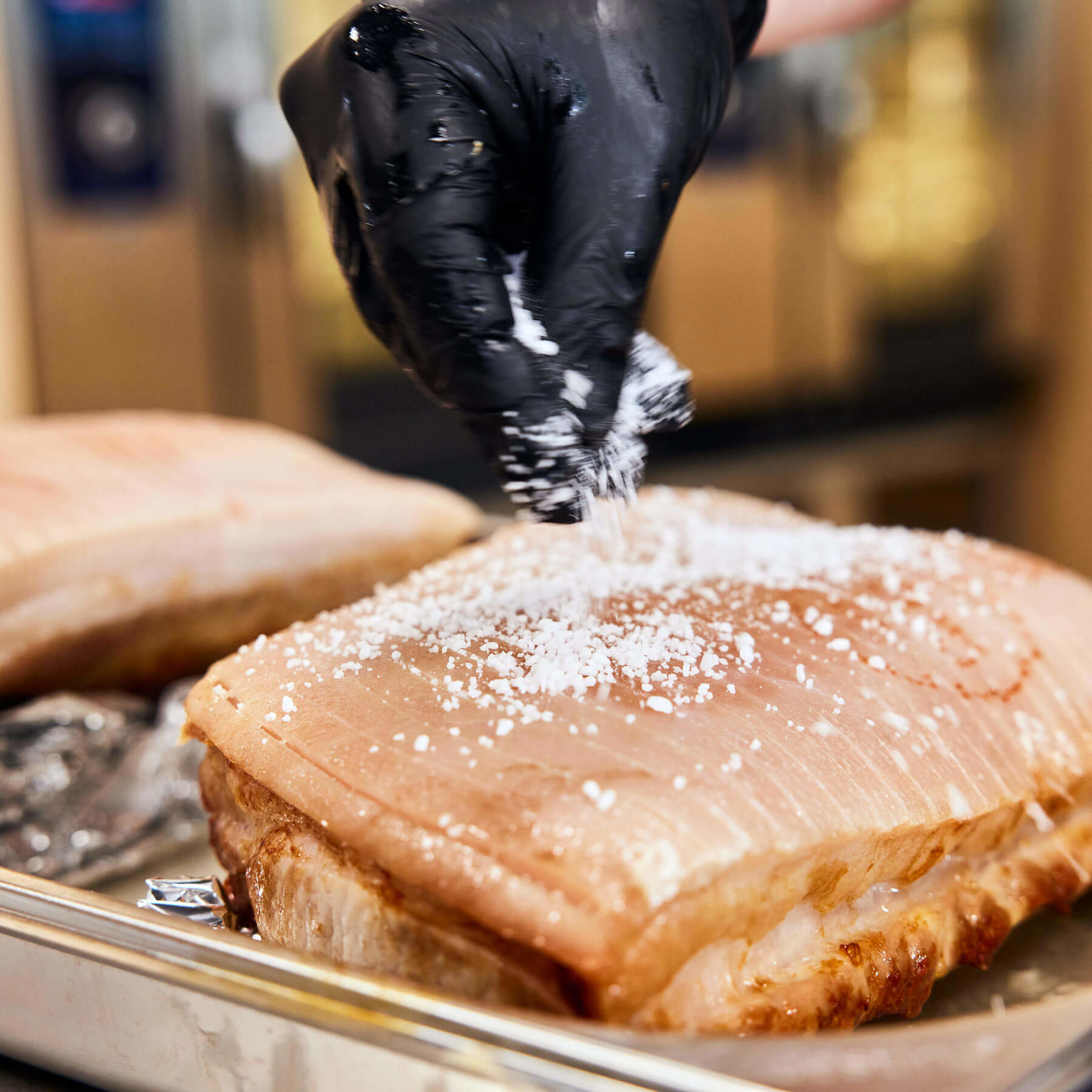 ”Men det produkt, jeg bruger mest af - det er den gode gamle kam af gris med svær,” siger kromanden med områdets mest ombejlede flæskesteg.