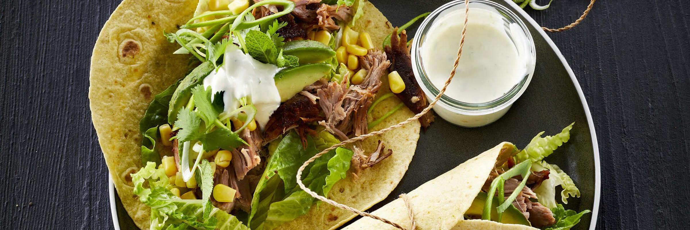 Vi foreslår nemlig at langtidsstege en velkrydret nakkefilet, indtil den bliver så mør, at den kan ’trækkes’ med et par gafler. Det supermøre, juicy kød pakkes herefter i en tortillawrap sammen med avocado i både, kerner fra grillede majskolber og masser af grønt i form af forårsløg, hjertesalat, koriander og mynte. Prikken over i’et er en frisk dressing på lime og creme fraiche.