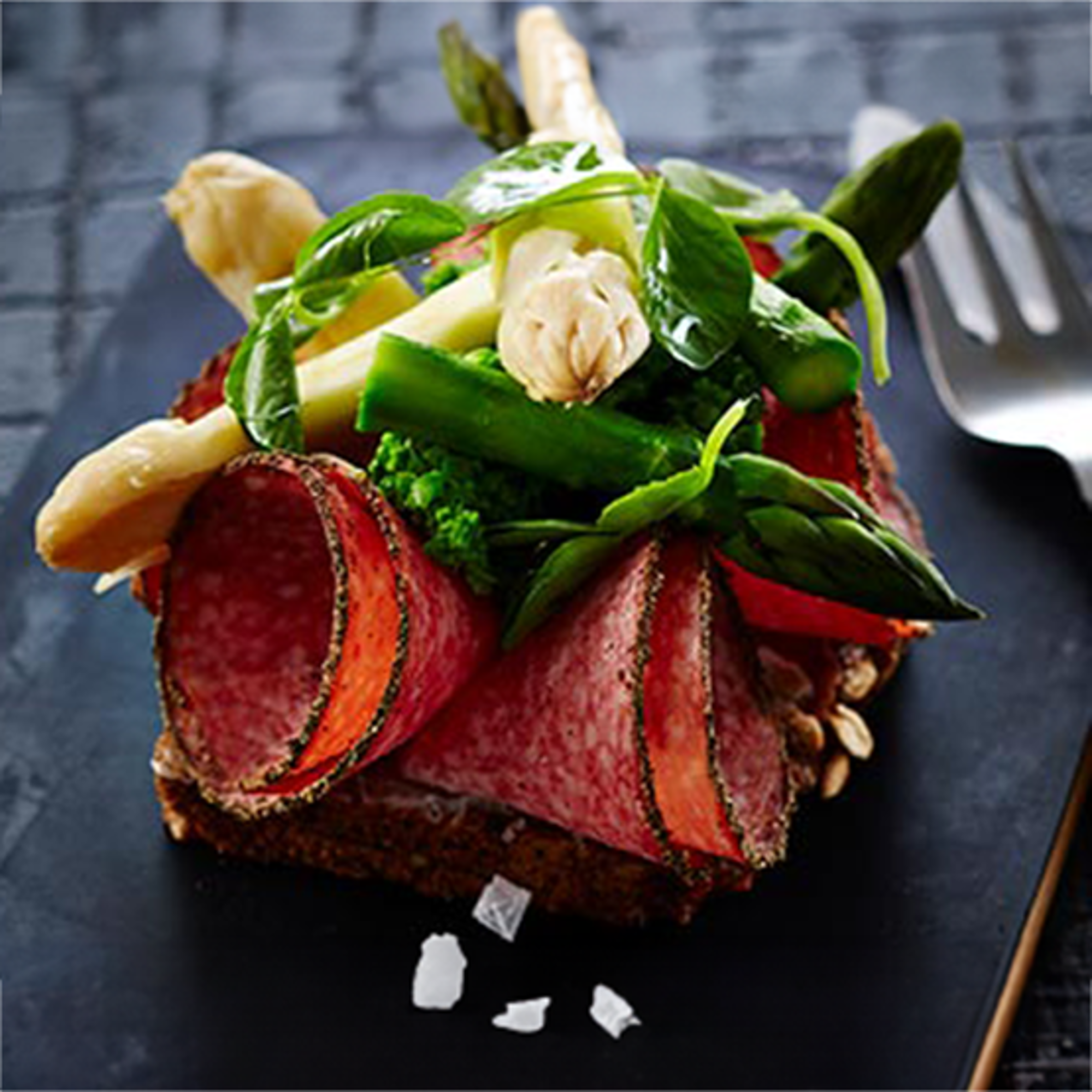 Vi kombinerer friskhakket kød og krydderier med den rigtige starterkultur, hvorefter vi fermenterer, ryger og tørrer salamien for at sikre en intens smag og en kødmættet struktur. Så du kan sætte frokostbordets ukronede konge på menuen.