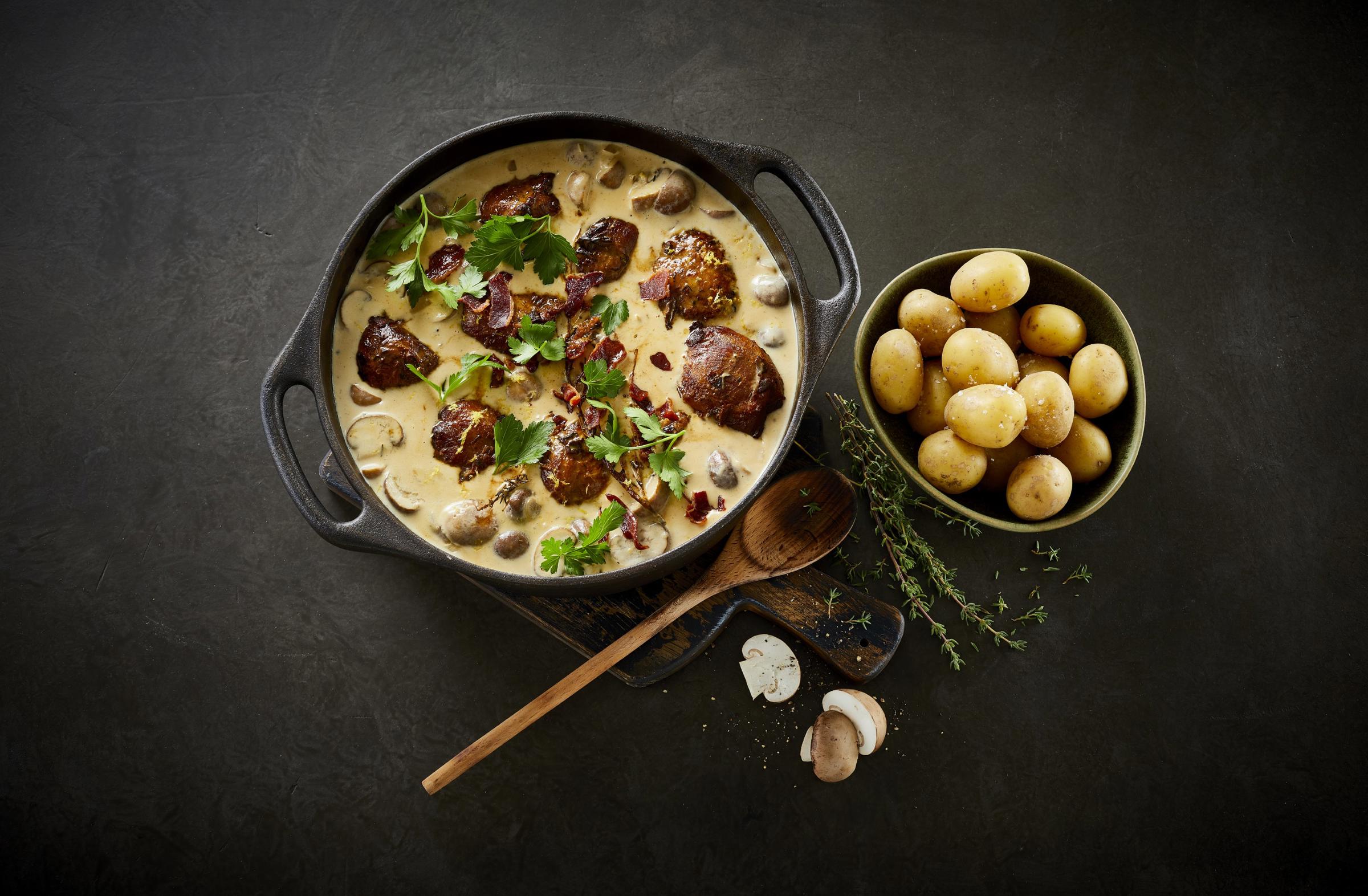 Møre skankeklumper af dansk gris med en svamperub bestående af bl.a. tørrede champignon, stykker af tomat, paprika og muskatnød. Oplagte til det travle køkken, hvor der stadig skal mørt kvalitetskød på menuen.