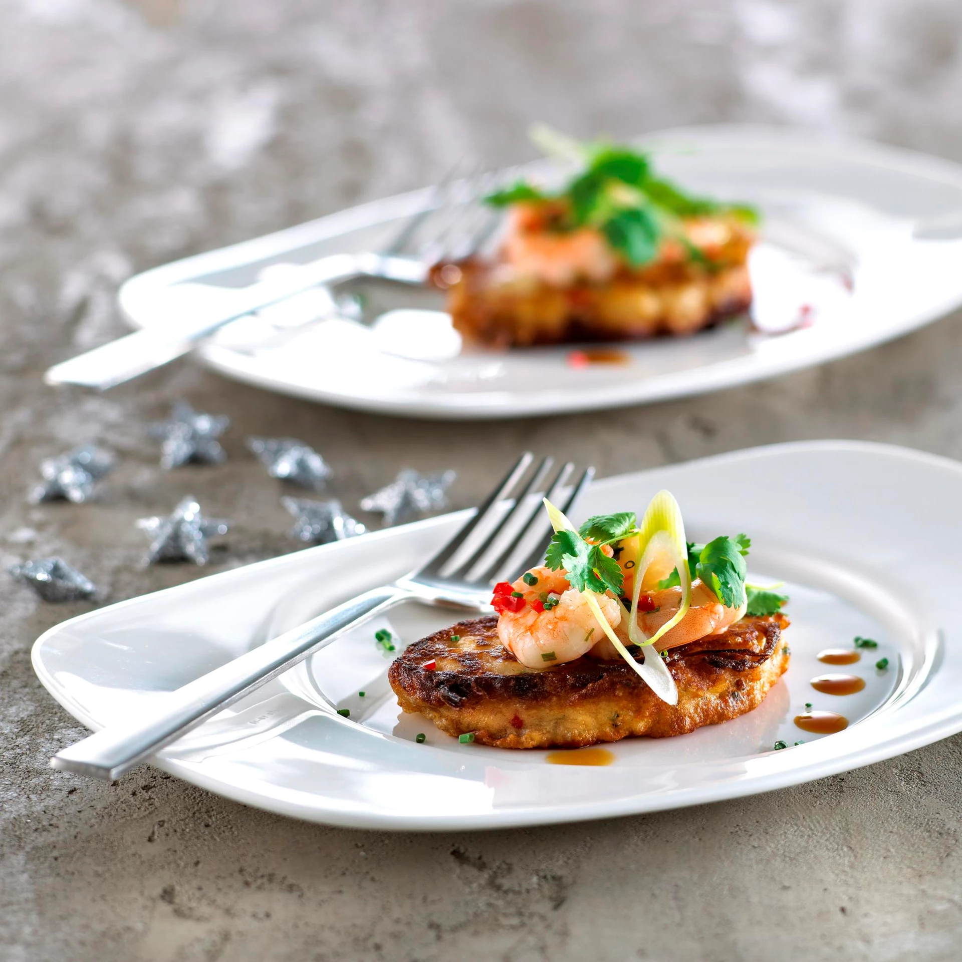 Snit det resterende forårsløg og anret klatkagerne med kæmperejer, chili, forårsløg og masser af plukket koriander.