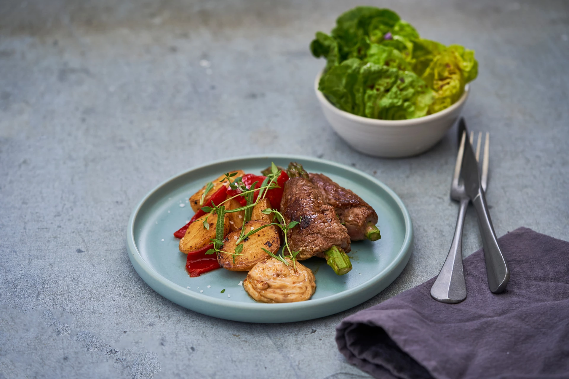 Lav kalvekødsrullerne lavet af asparges svøbt i tynde skiver af kalveinderlår serveret med kartofler, pestomayonnaise og en grøn salat med vinaigrette.