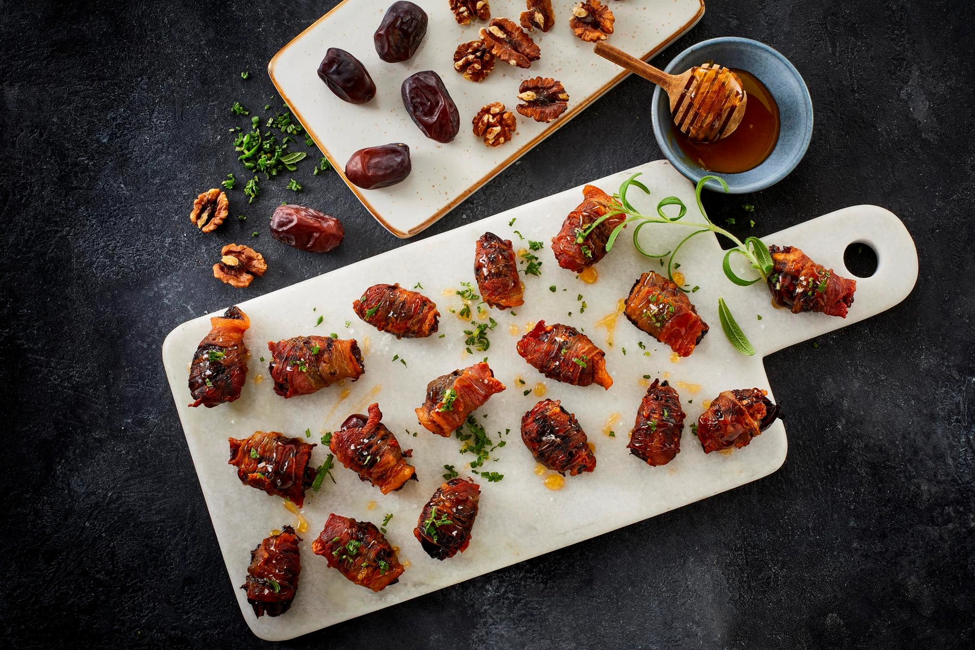 Skær baconskiverne i to. Pil stenen ud af dadlerne. Sæt en dadel sammen med en valnød og rul en baconskive omkring. Luk med tandstikker. Kom bacondadlerne på en bageplade med bagepapir.