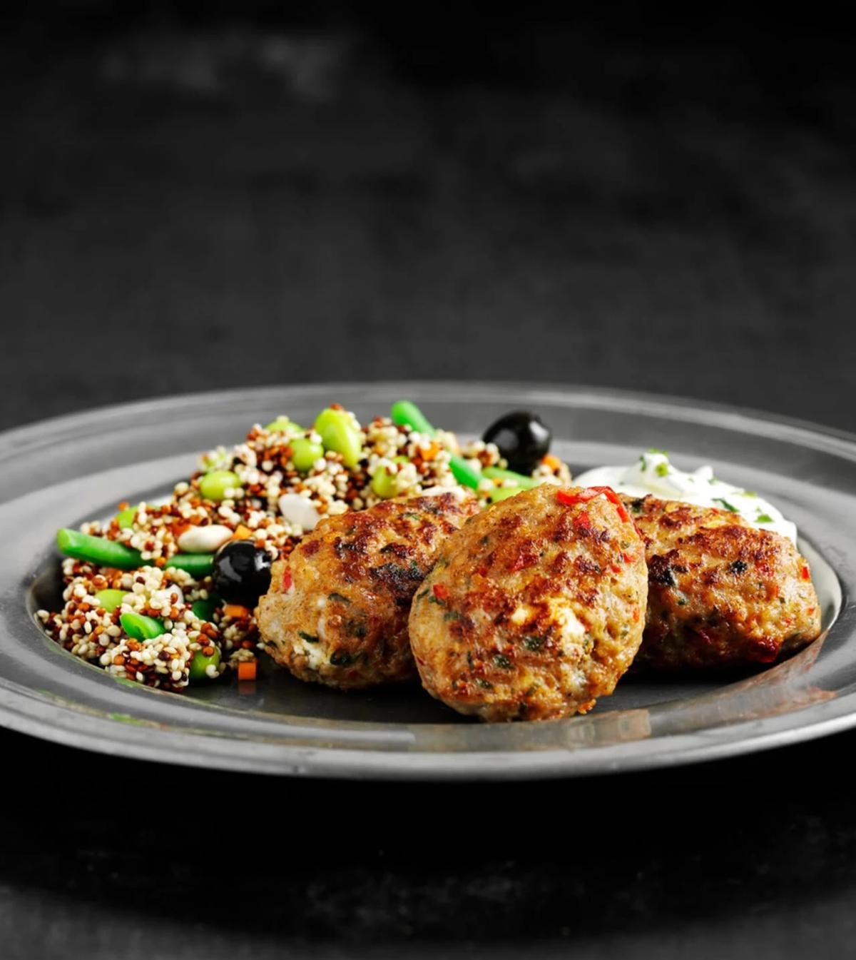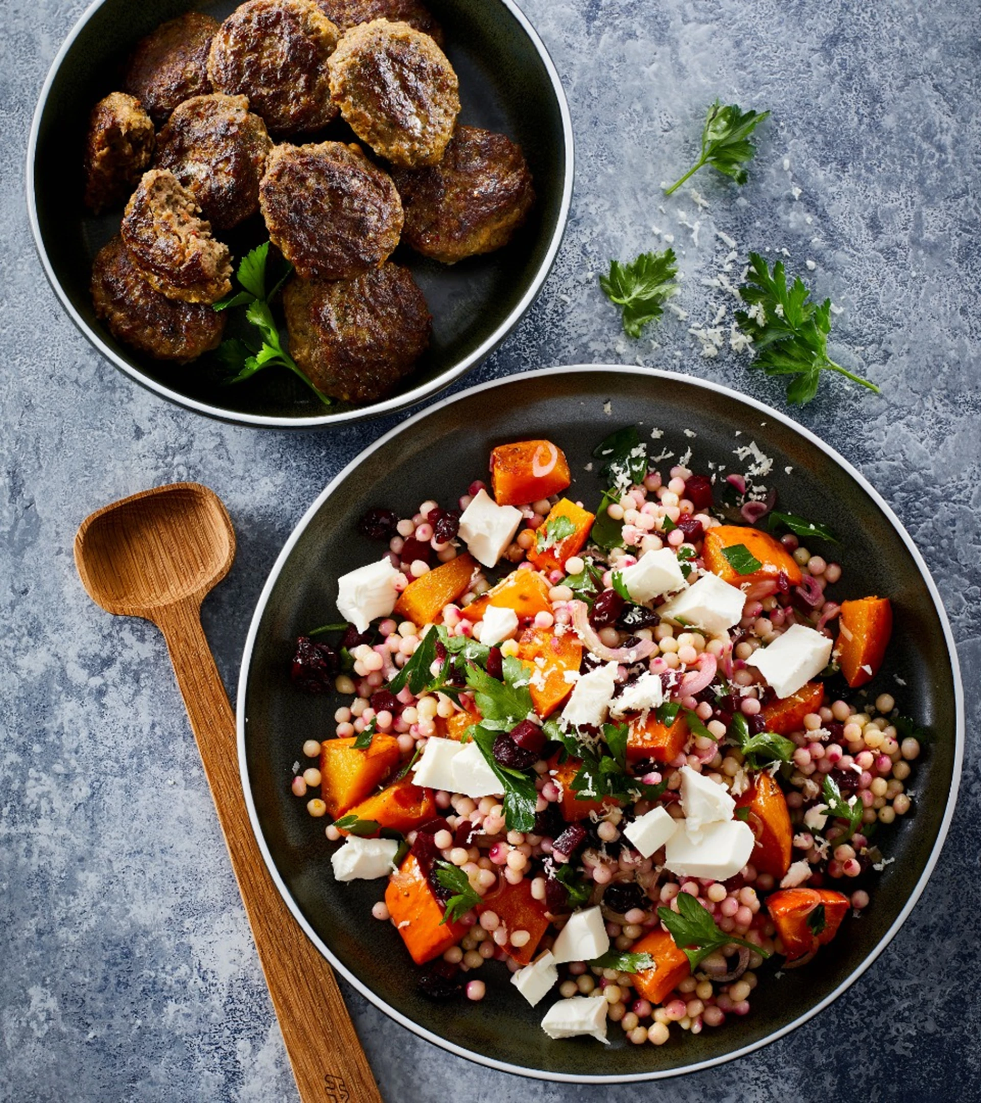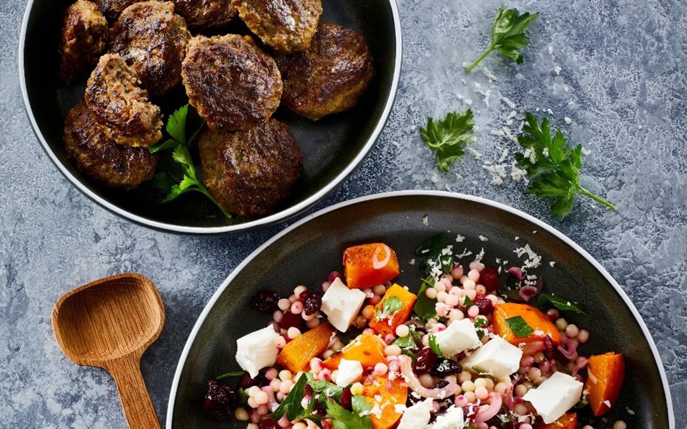 Frikadeller med couscous, græskar og feta