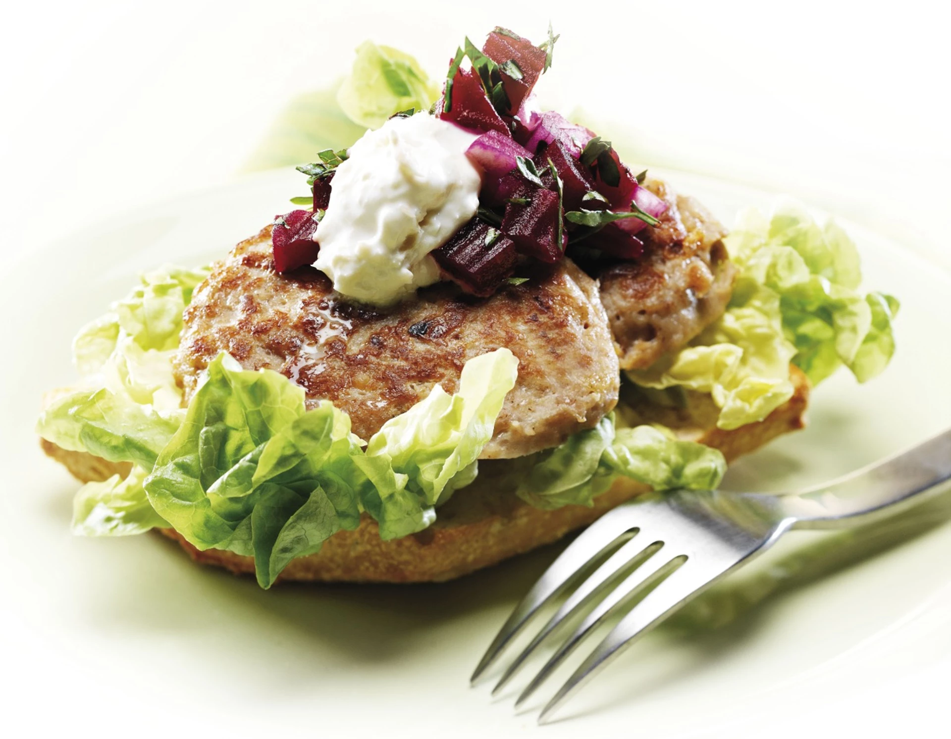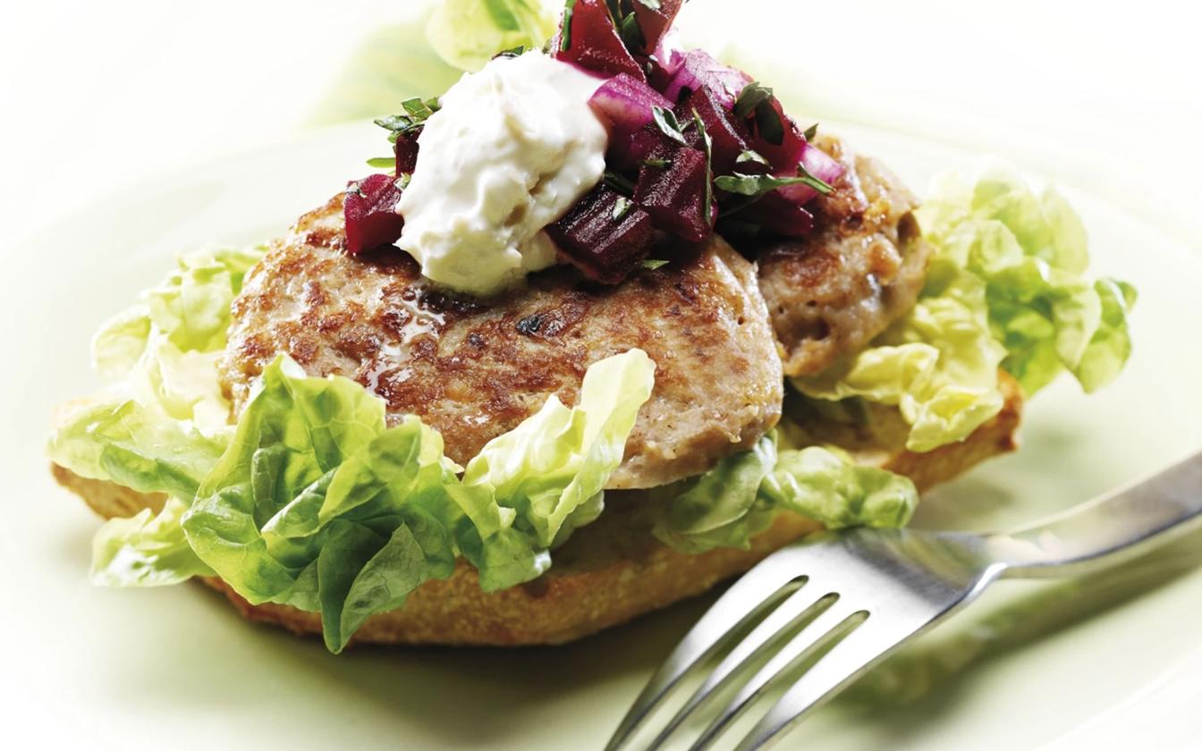 Frikadellesandwich med peberrodscreme og rødbede