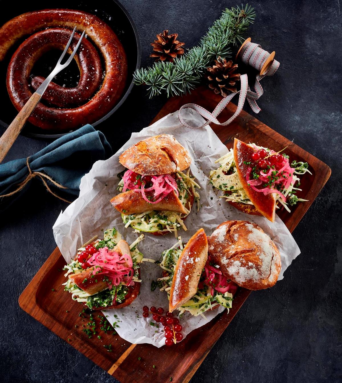 Hotdog med medister, dijonnaise og rødkålssalat