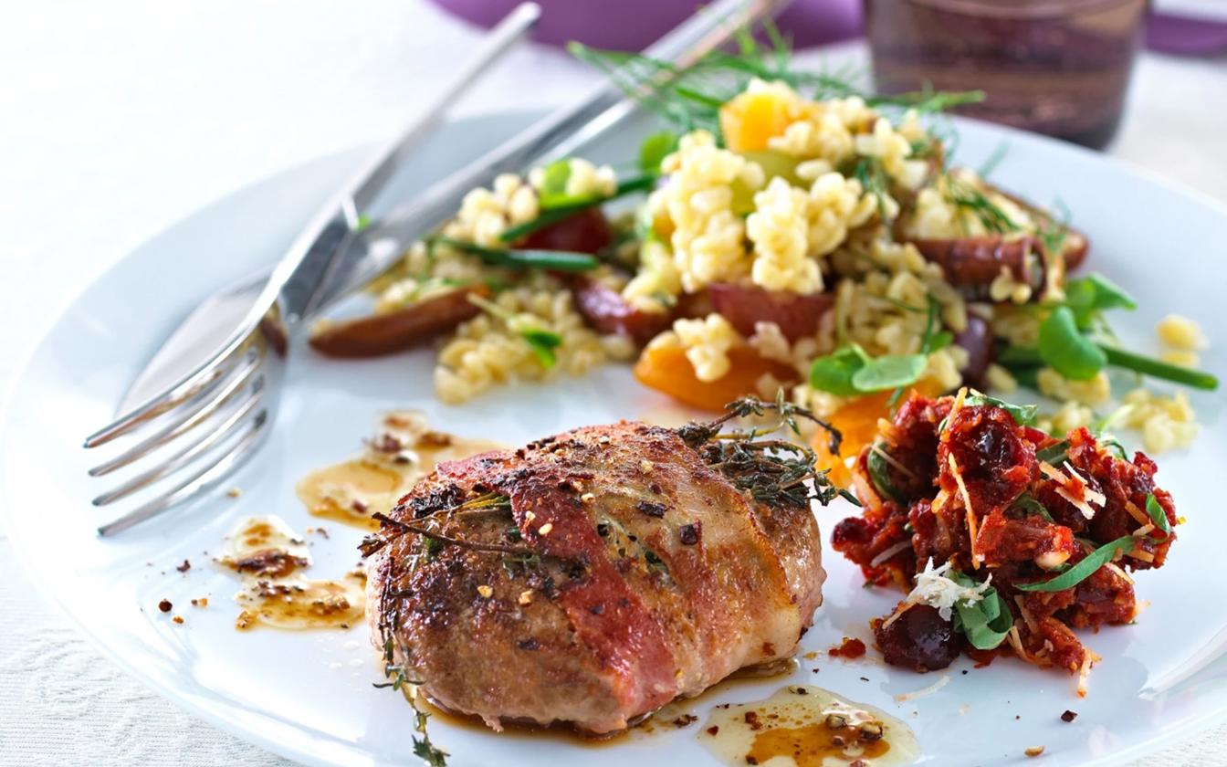Karbonader med bacon, timian og julebulgur