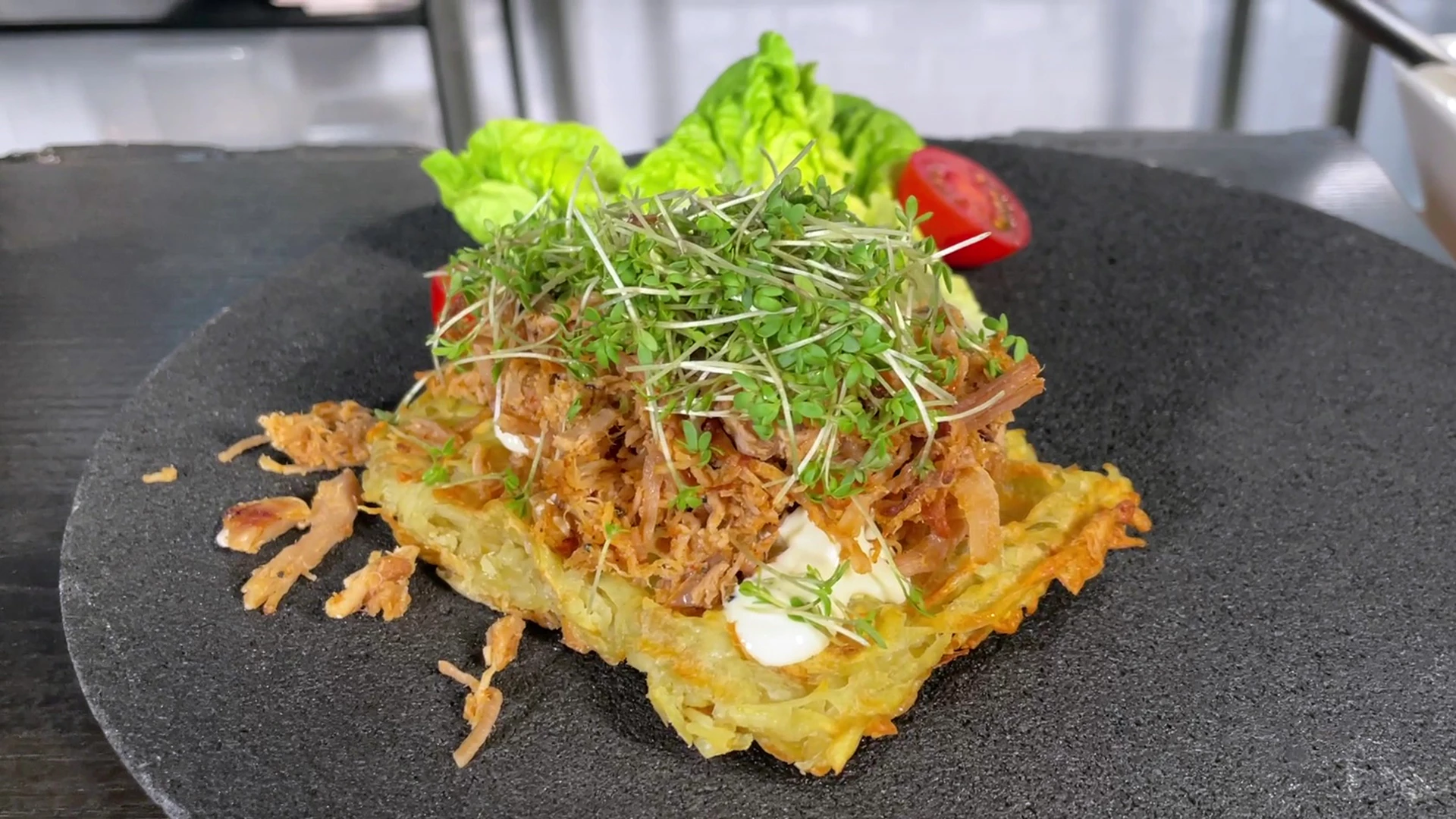 Smør wasabicremen på vaflerne og anret Pulled Pork oven på. Pynt med karse og servér.