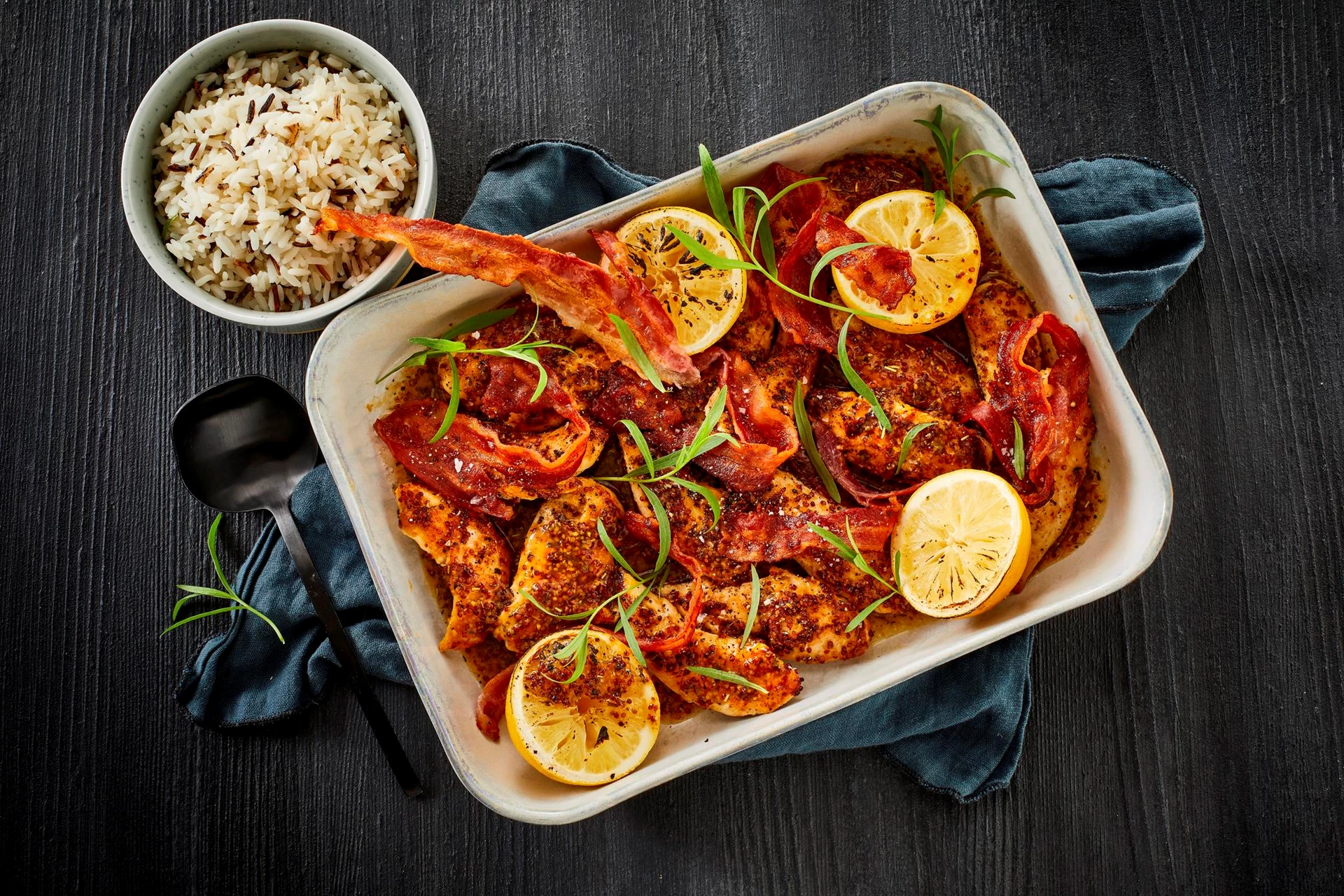 Læg de sprøde baconskiver over kyllingen og pynt med frisk estragon