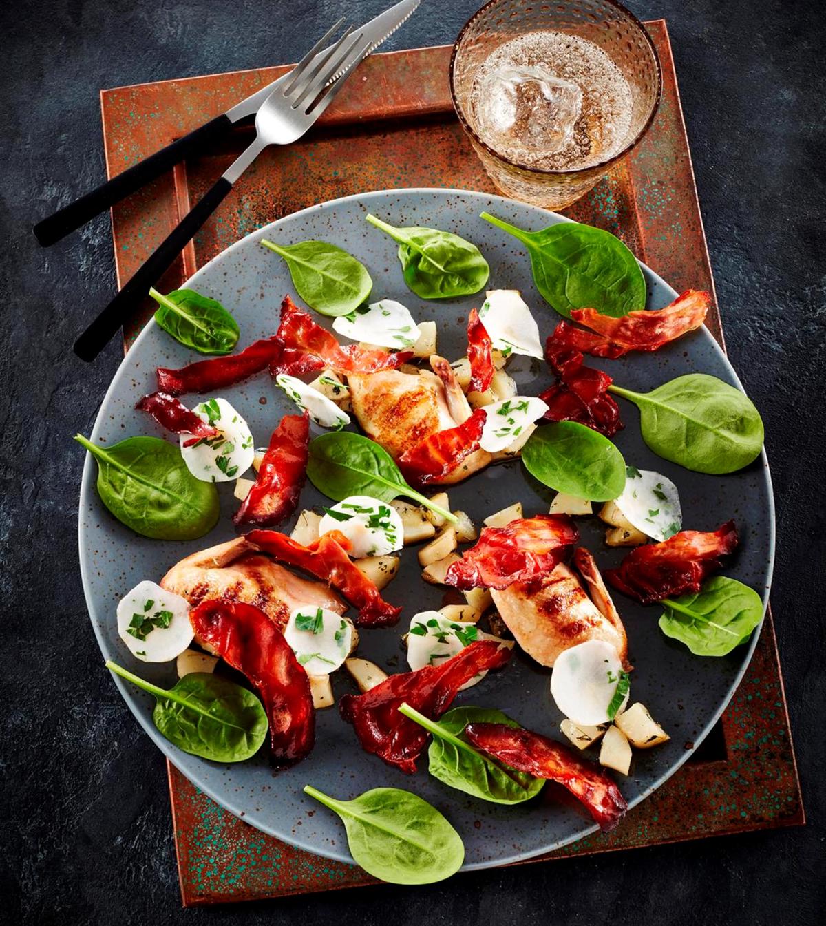 Lufttørret skinke med vagtelæg og basilikumcreme