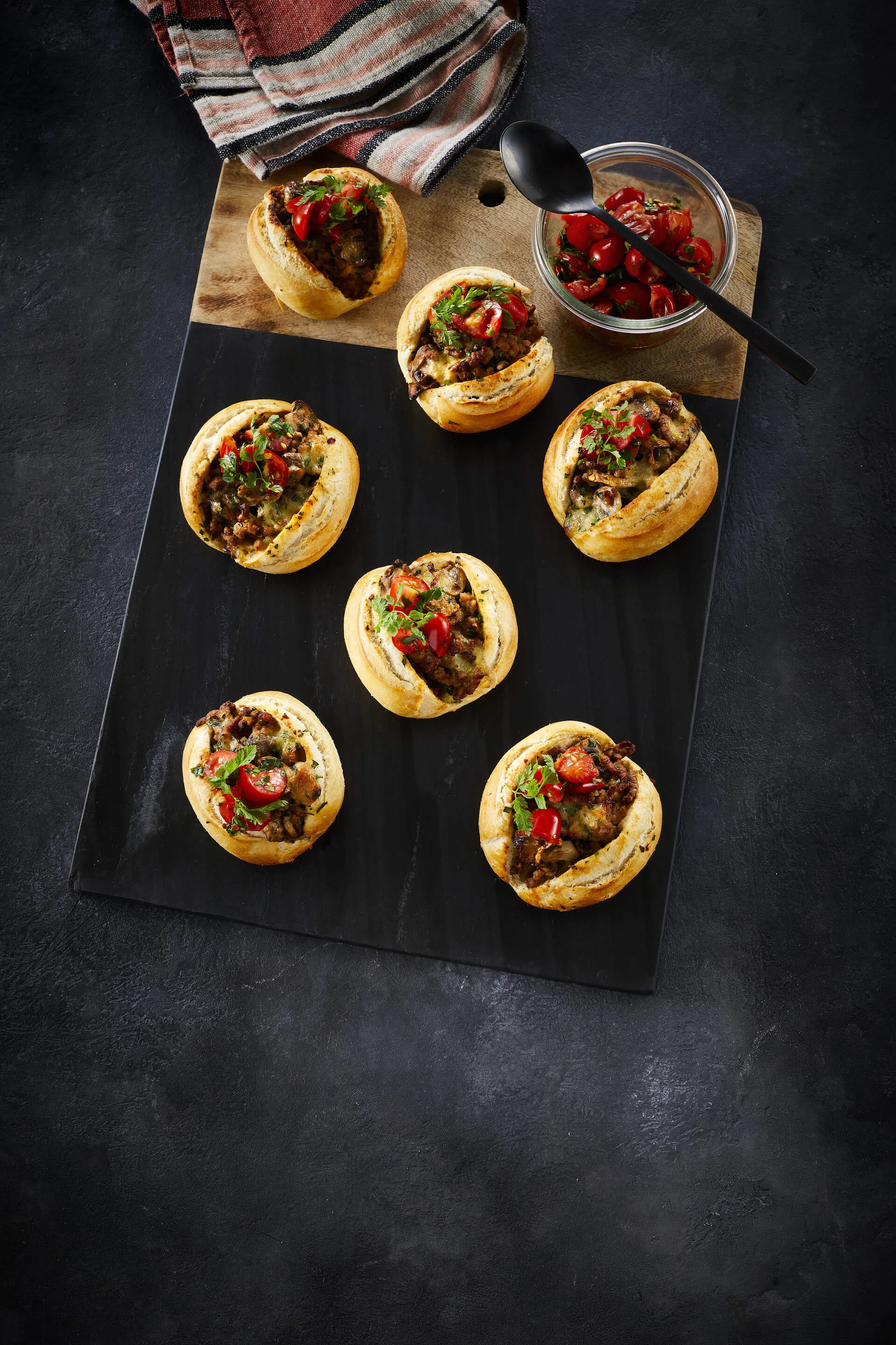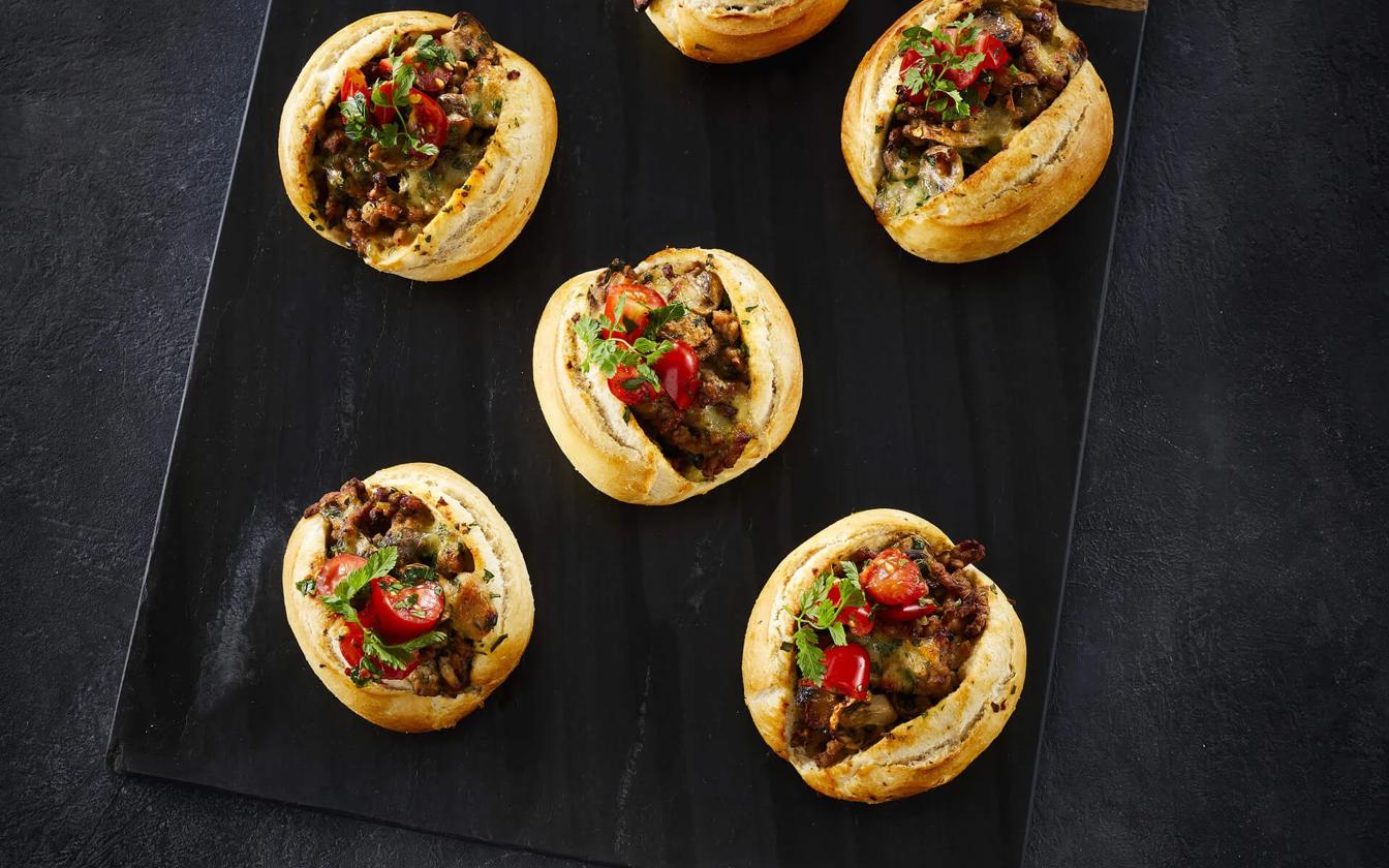 Mini baguette med hakket gris og tomatsalat