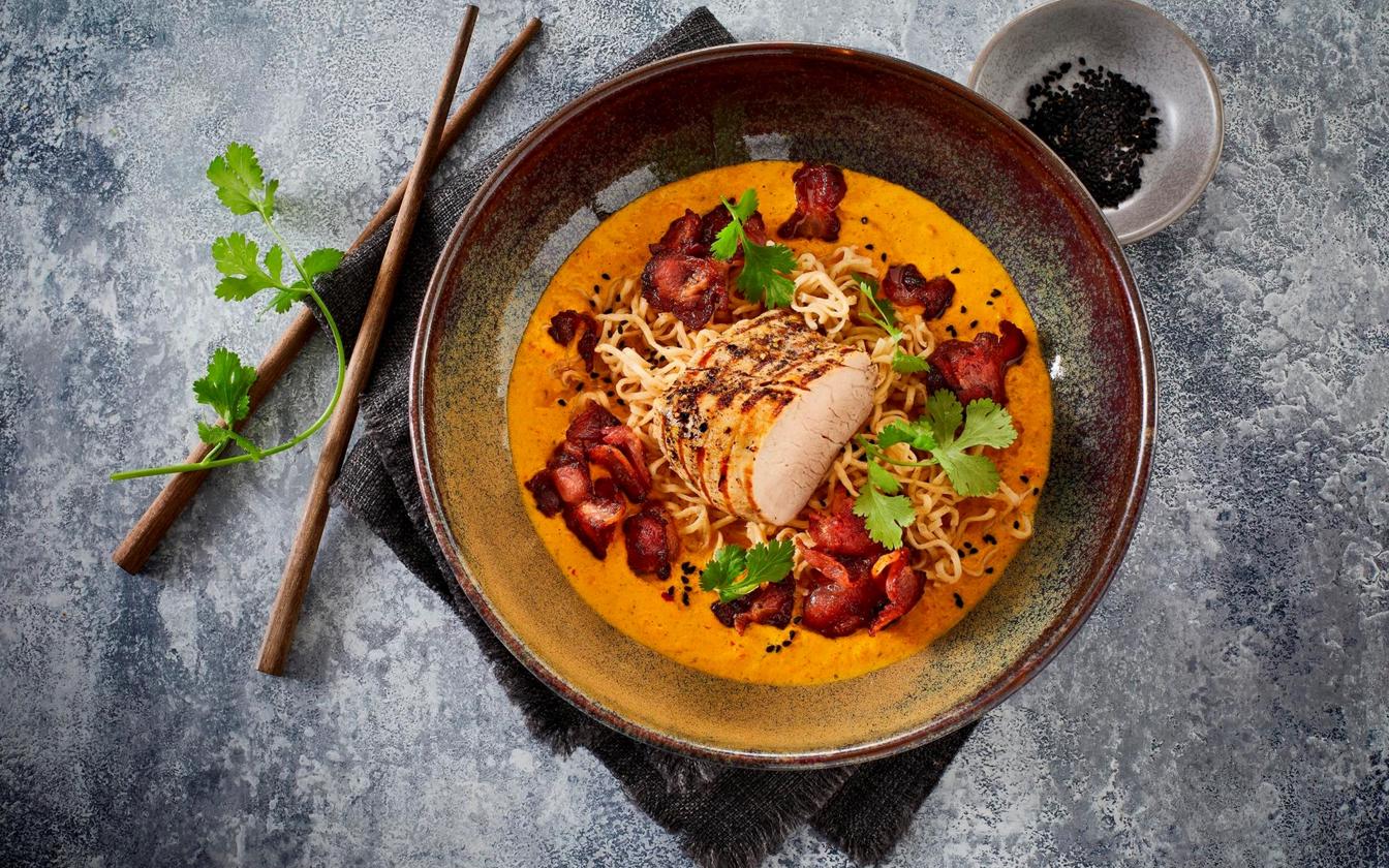 Mørbrad af gris med nudler, bacon og karrysauce