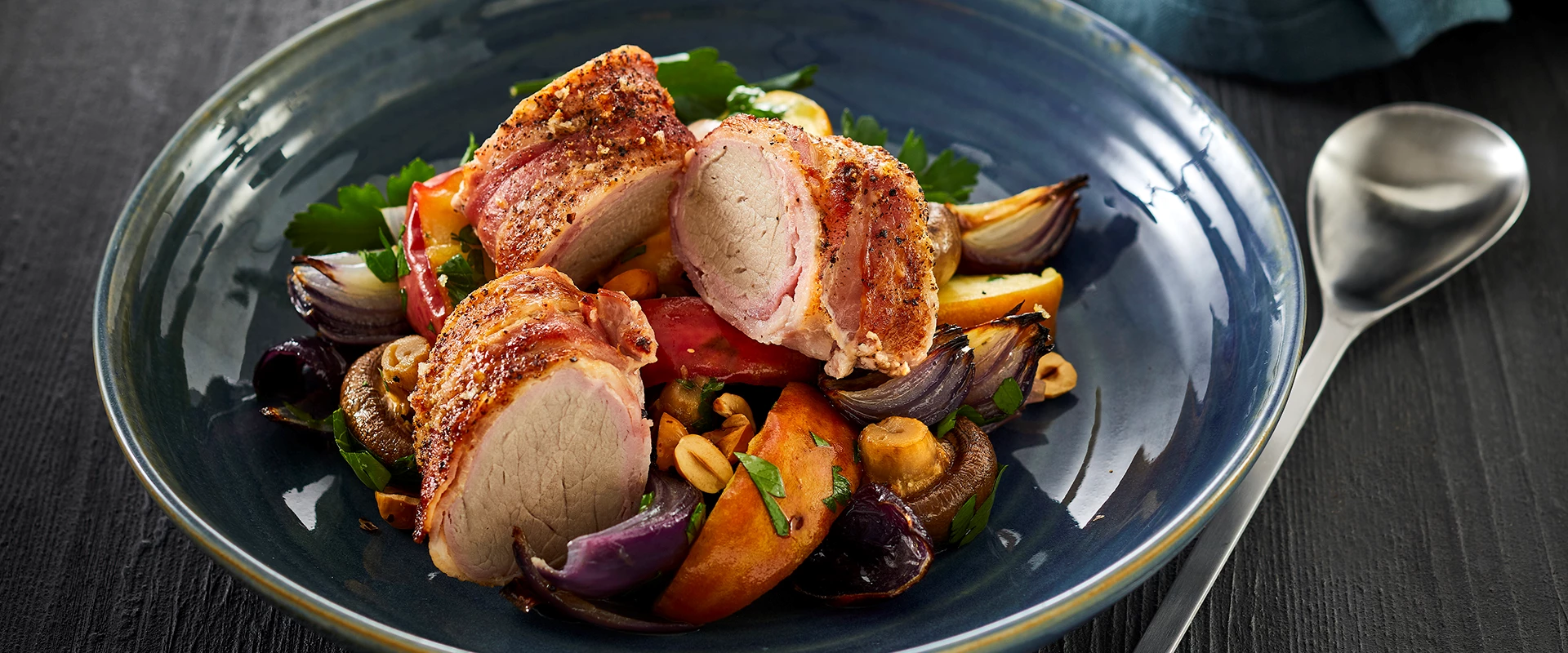 Mørbrad i bacon med bagte æbler, svampe og løg
