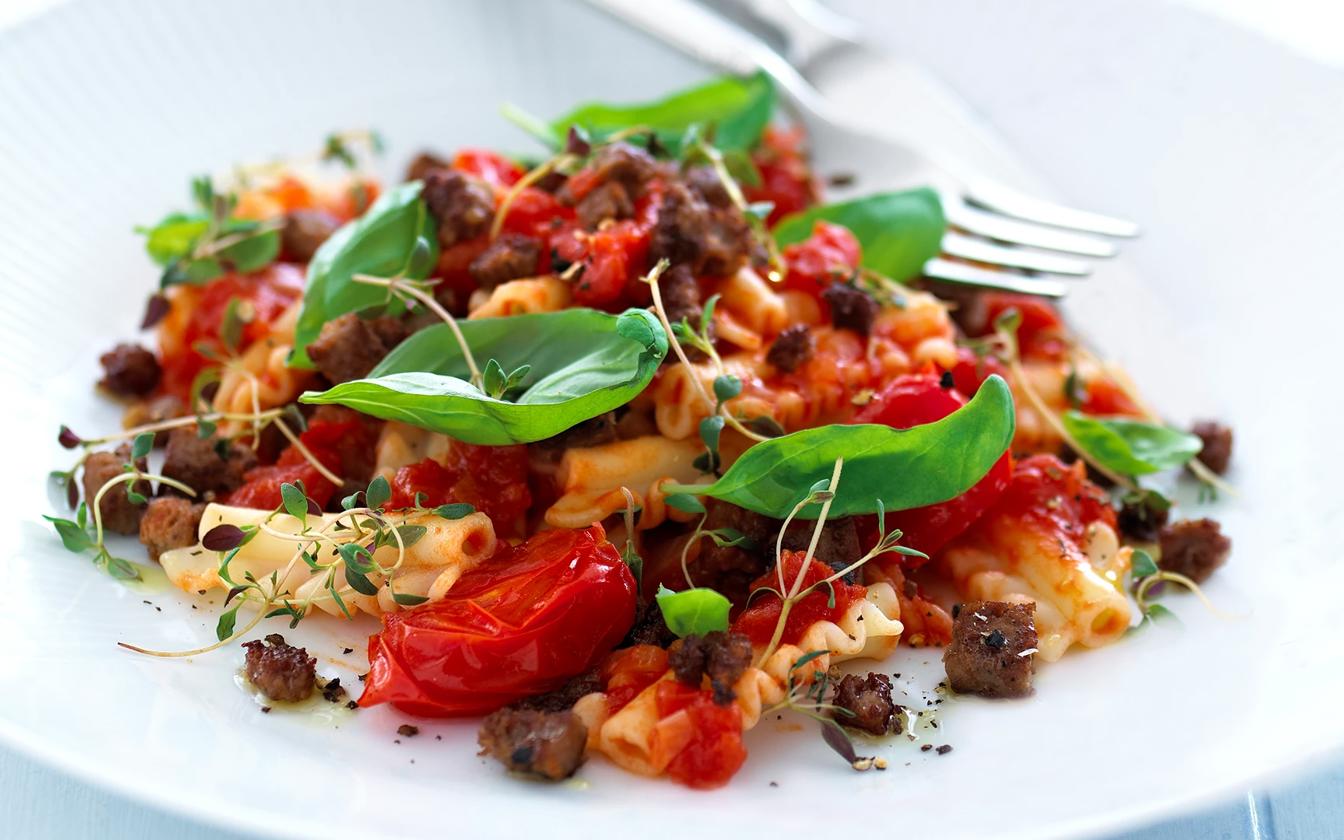 Pasta med oksekød, timian, parmesan og tomatsauce