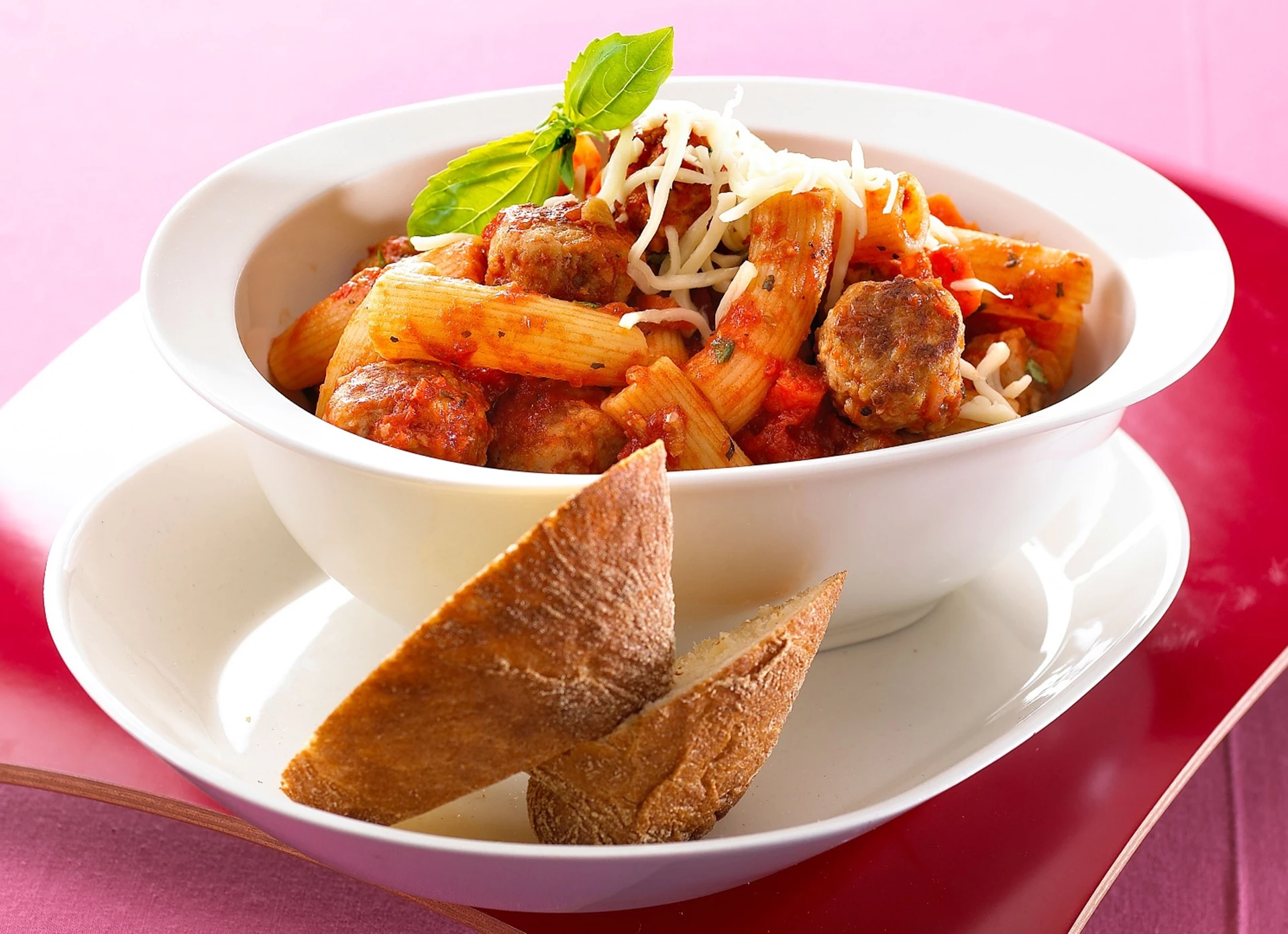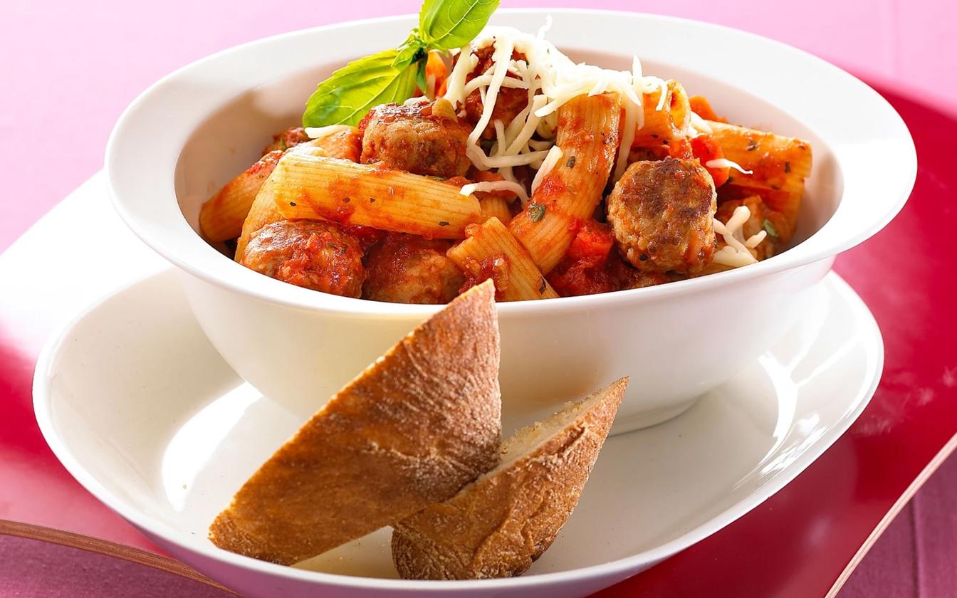 Pasta med tomatsauce og mini frikadeller