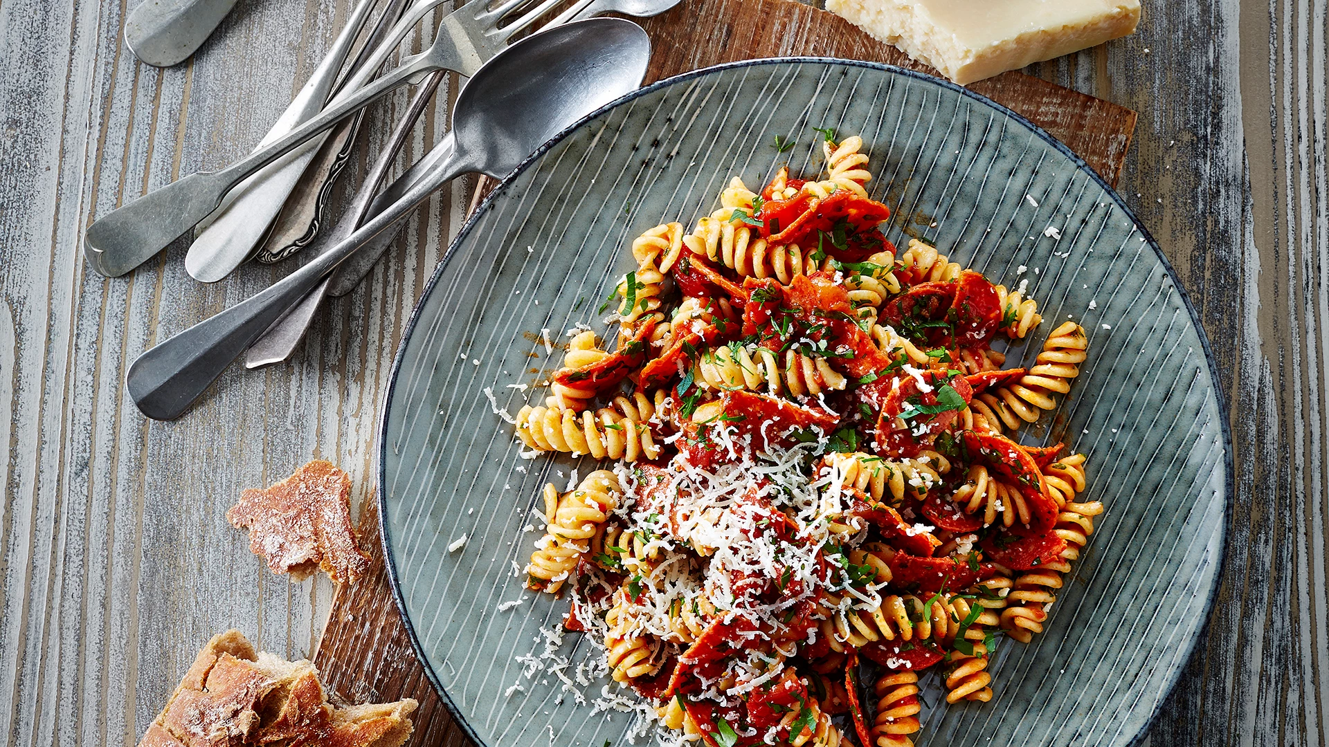 Pasta Tomato Calabrese er en enkel og smagfuld ret, der kombinerer al dente pasta med en fyldig tomatsauce og den krydrede smag af Calabrese-pølse. Løg og hvidløg svitses let i olie for at fremhæve deres sødme, inden de møder den rige tomatsauce. Retten toppes med friskrevet parmesan og et strejf af sort peber for en autentisk italiensk smagsoplevelse. Perfekt til en hurtig middag.