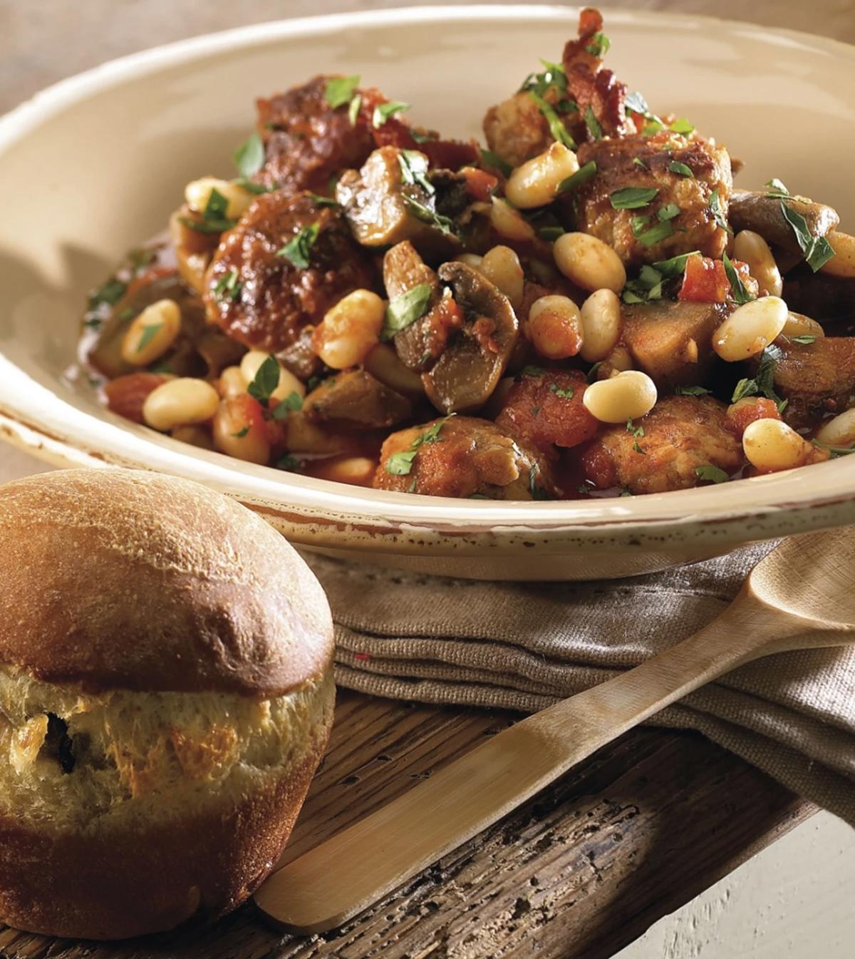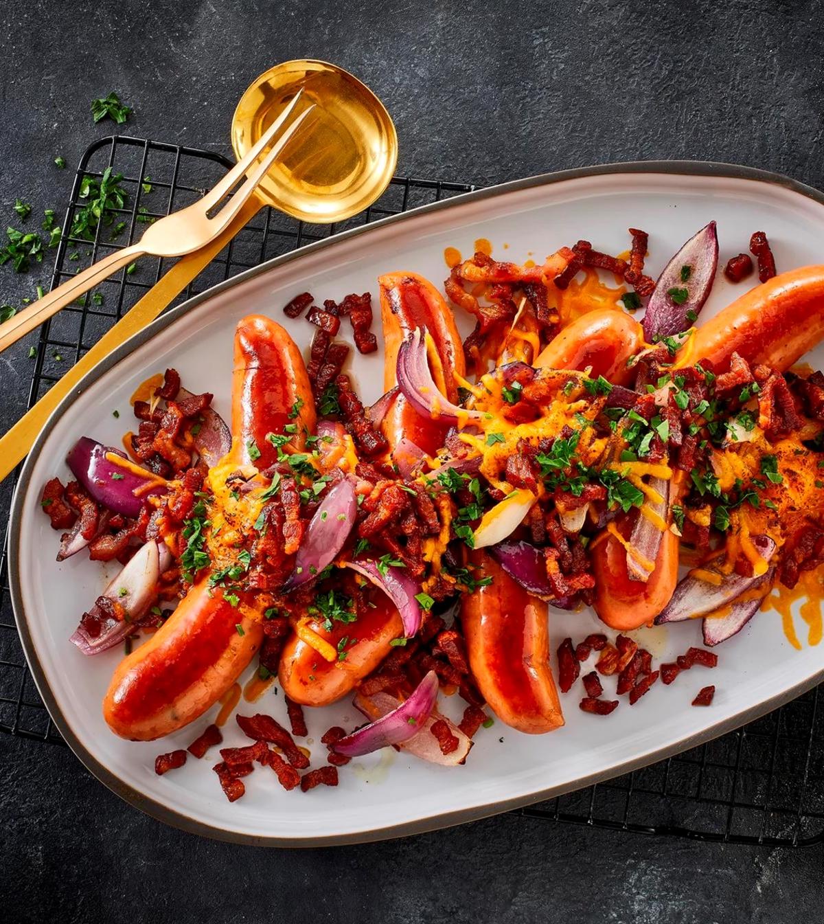 Pastagratin med bacon, frikadeller og tomatsauce