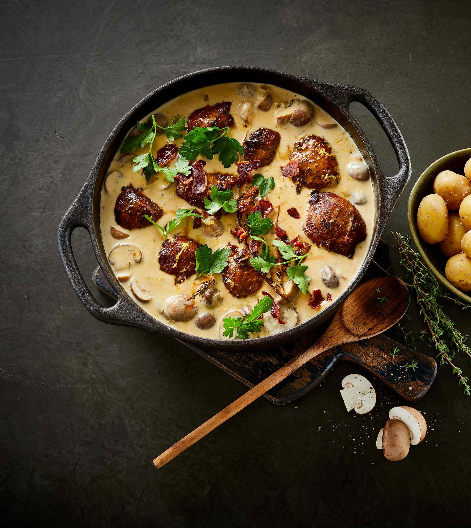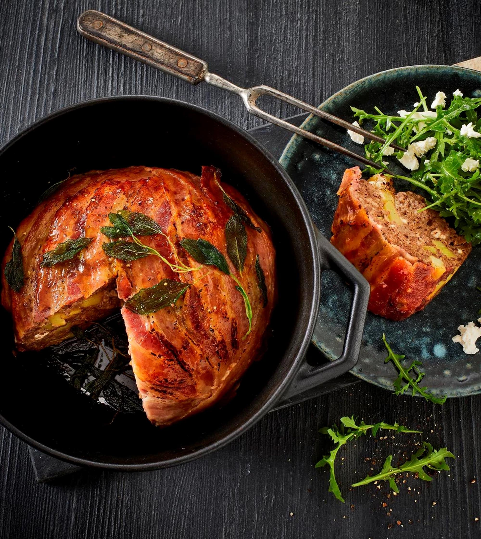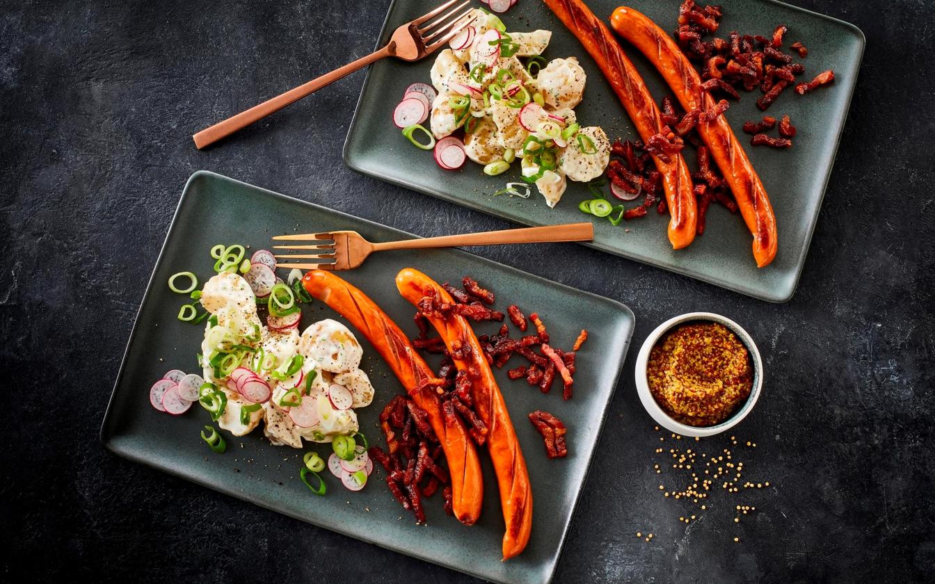 Stegte pølser med kartoffelsalat og sprøde bacontern
