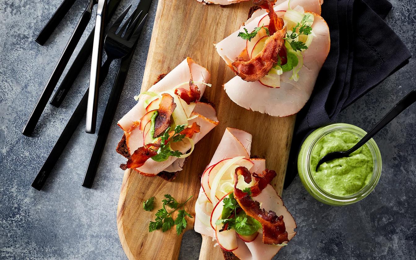 Rugbrød med kalkunbryst, persillemayo og bacon