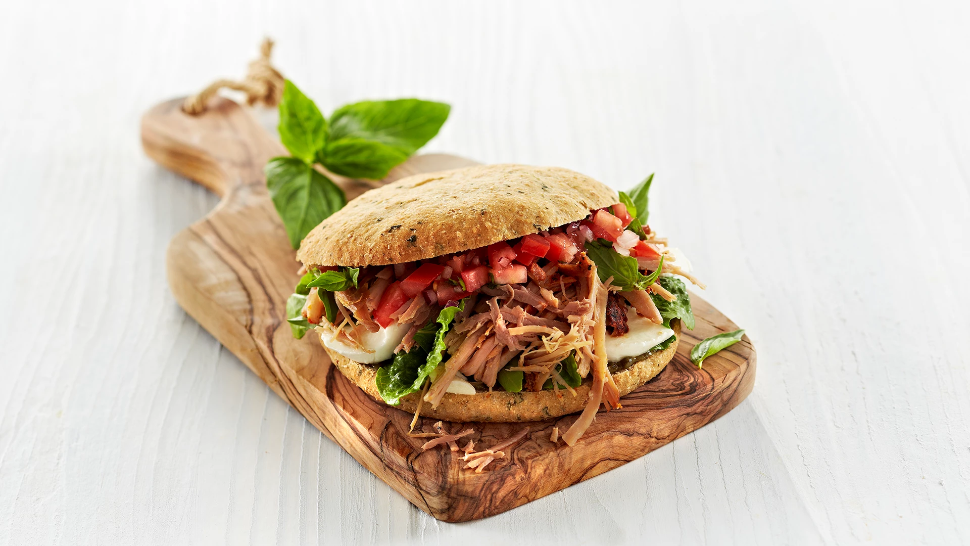 Sandwich med pulled pork, tomatsalsa og mozzarella