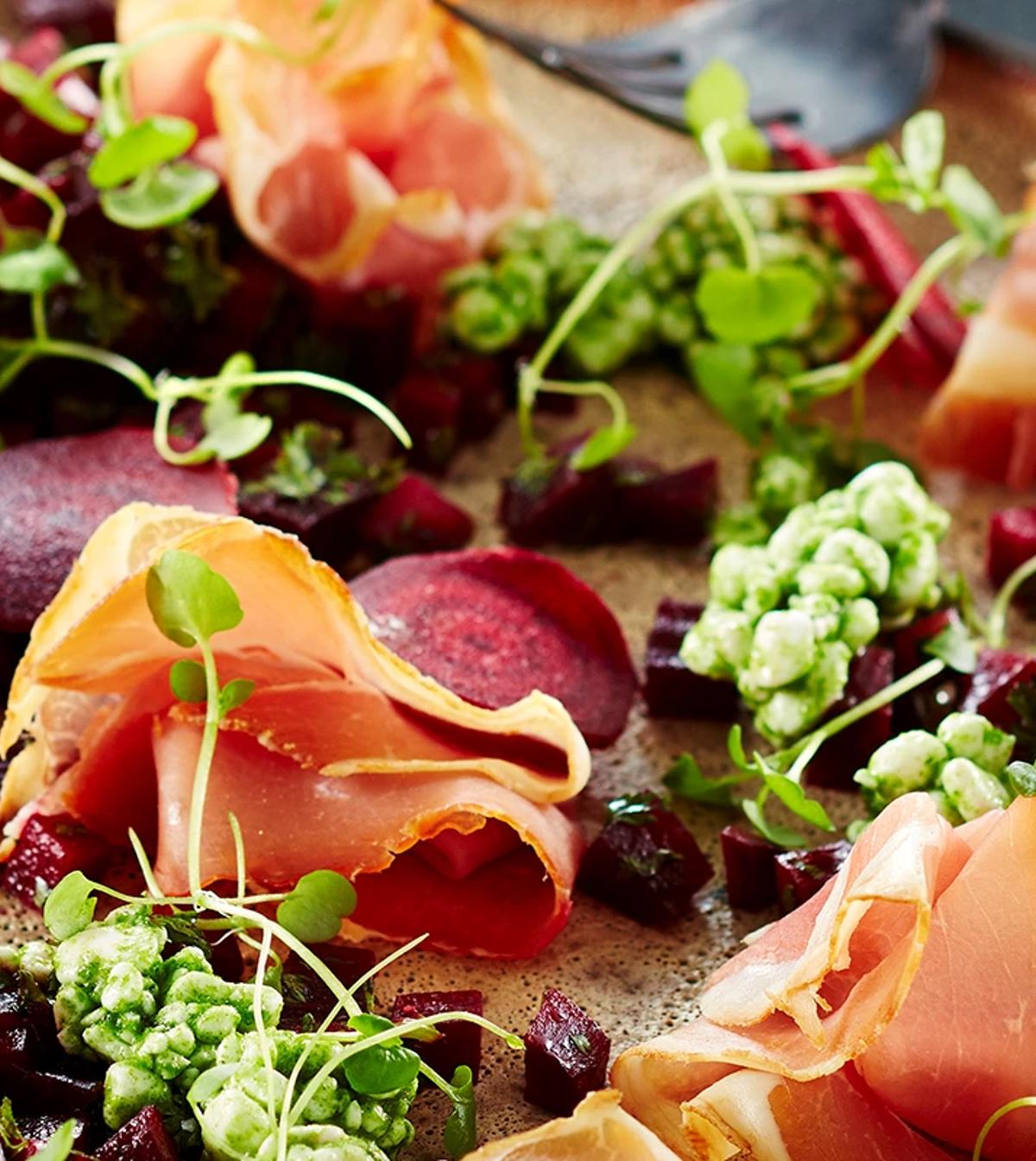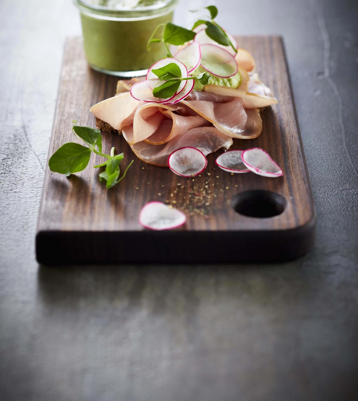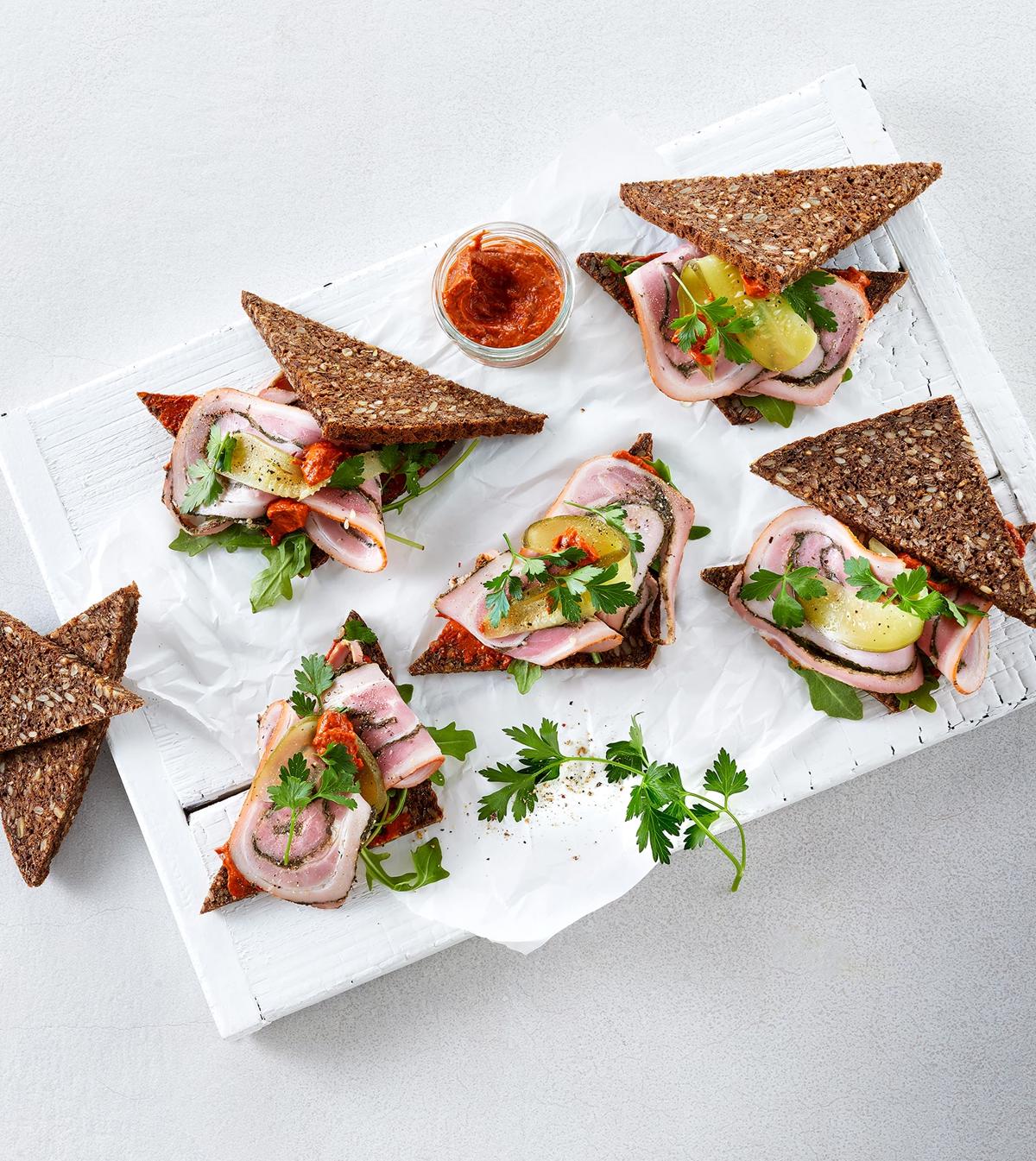 Sandwich med røget filet, røræg og hytteost